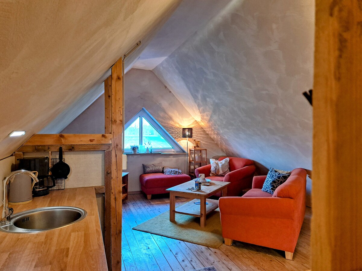 Genieße die Ruhe – in dieser geräumigen, lehmverputzten Unterkunft. Diese Ferienwohnung mit eigenem Hauseingang, großem Garten und Terrasse ist eine Natur-Erholungs-Oase mit natürlichem Design, wärmendem Licht, welches sich durch den Lehmputz und großen Fenstern ergibt. Die Galerie schenkt der Wohnung ein großzügiges Raum-Gefühl mit Deich- und Flussblick. Ein Pelletofen versorgt die Wand- und Fußbodenheizung und schenkt gleichzeitig durch seine wärmende Flamme noch mehr Gemütlichkeit.