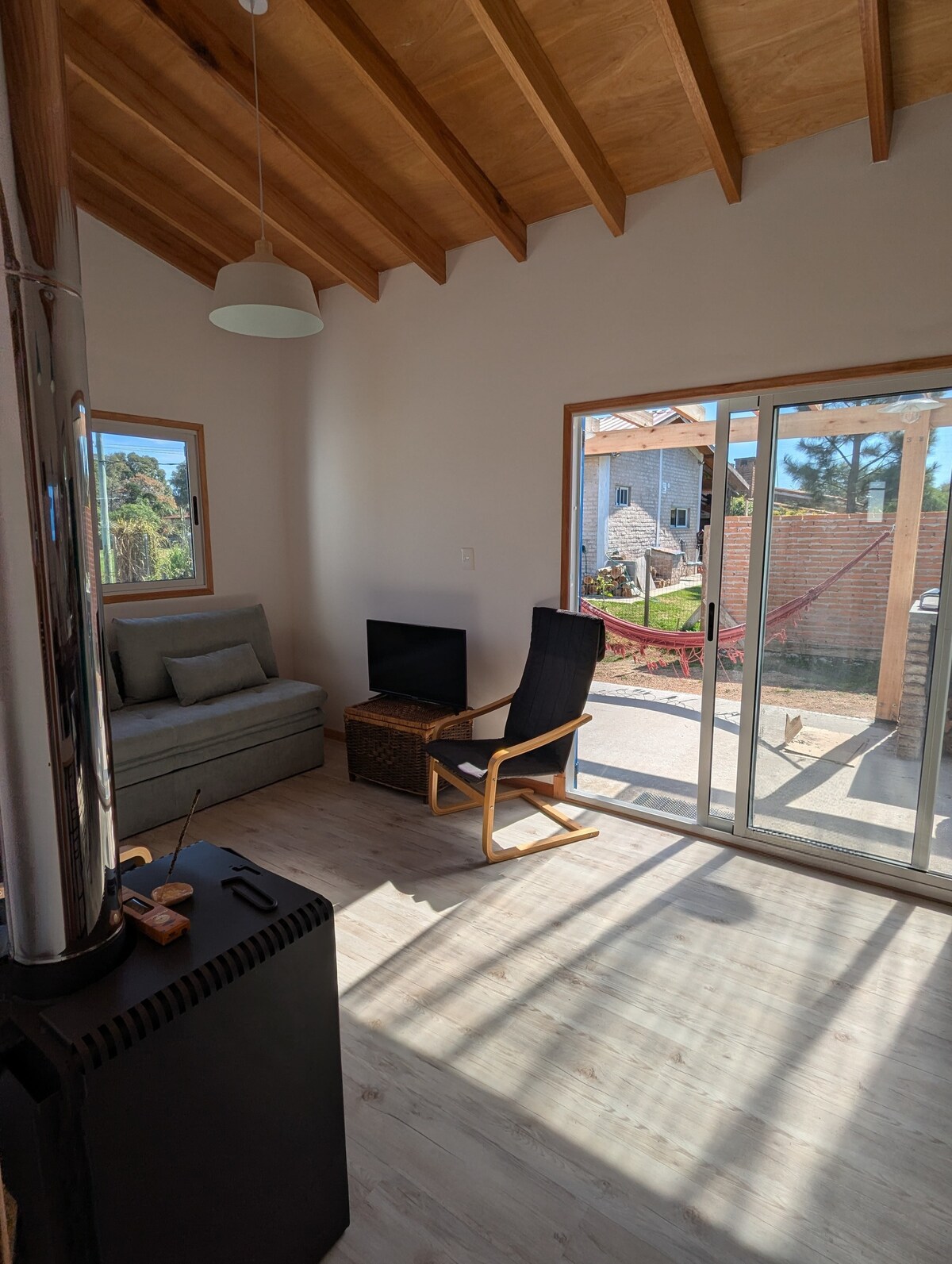 Una casa nueva para disfrutar del entorno playero. Con 41 m² bien aprovechados, alberga hasta 5 huéspedes. Cocina, comedor y living integrados, 2 dormitorios y baño completo. La galería con parrillero techado se abre al jardín en desarrollo, donde las plantas recién comienzan a crecer y dar forma al entorno verde que rodea la casa. Hamaca paraguaya, sombrilla, sillas de playa. Terreno cercado, permite estacionar dentro de la propiedad.