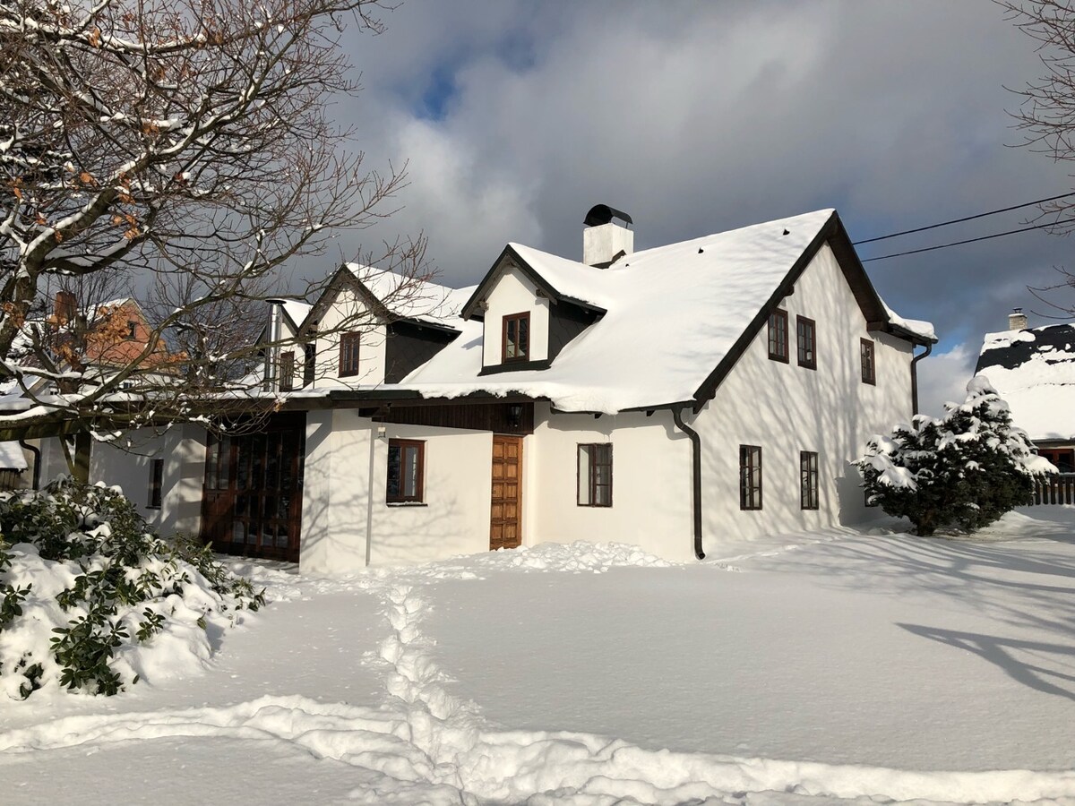 Das komfortabel eingerichtete Ferienhaus ist ganzjährig nutzbar und liegt in einem malerischen Dorf 820 m über dem Meeresspiegel auf einem eigenen eingezäunten Grundstück (890m²). Die Nutzfläche des Hauses beträgt 320m². Ideal für 8 Personen (3 Schlafzimmer) + 2 Personen( Schlafsofa im Wohnzimmer). Es gibt eine geräumige Sauna mit einem Kühlpool, ein Zimmer mit einem Tischtennisplatte. Im Gartentrampolin können Kinder Rutsche, Schaukeln, Sandkasten und Baumhaus nutzen. Der Wald ist 50 m vom Ferienhaus entfernt.