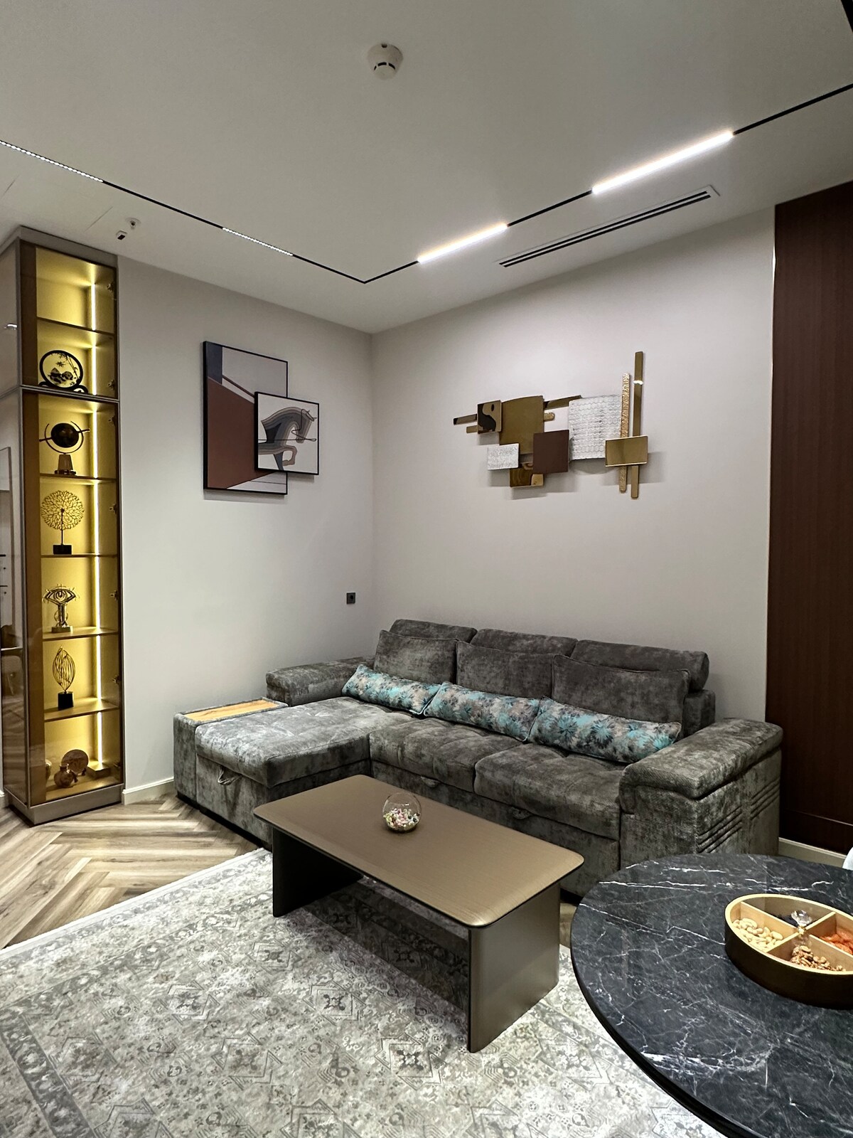 Experience staying in urban life in a contemporary setting. This studio unit is integrated w/ various in-built amenities, fully integrated appliances with a peaceful ambiance. It is easily accessible to malls, the airport is a short drive away, alongside Bobur street, & minutes away to the beautiful Magic City Park and Tashkent City Park. Ideal for couples, friends & small families. This is your home away from home while you explore Tashkent!