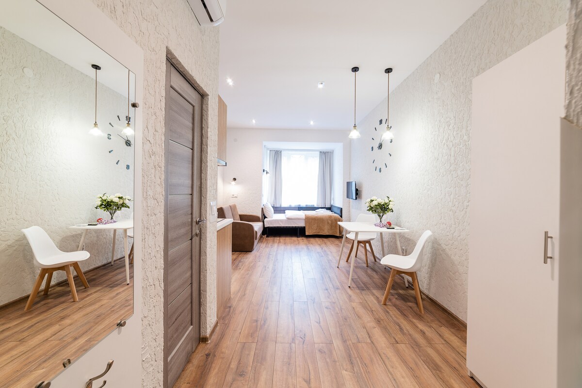 Eine neue und gemütliche Wohnung im Loft-Stil wird dich angenehm mit Platz, Gemütlichkeit und Licht überraschen. Sobald du hier bist, wirst du dich wie zuhause fühlen) Du wirst die Buchung auf jeden Fall nicht bereuen. Und werde definitiv wiederkommen.