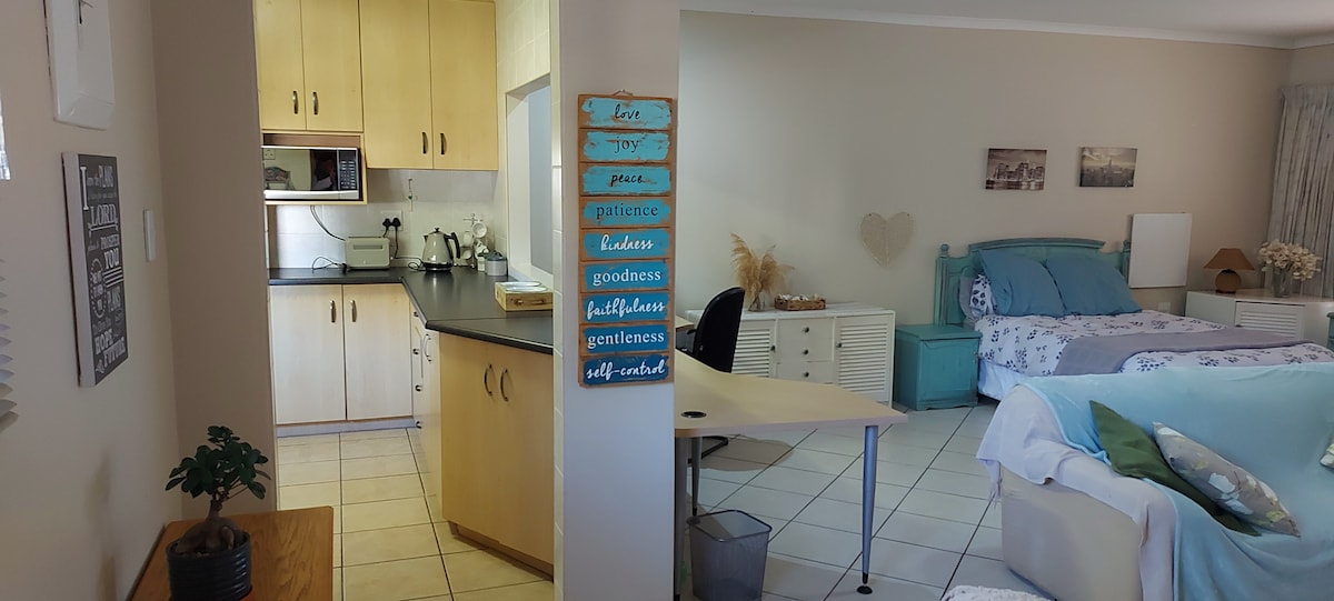 Cottage, fully furnished, self contained. Central location and close to all amenities. Back-up solar system. Private accommodation, lounge with smart tv, bedroom with double bed, en-suite bathroom with a toilet, basin, shower and towels. Dining area. Kitchenette ✔ Utensils ✔ Fridge ✔ Microwave Oven ✔ Kettle ✔ Toaster ✔ Basin No stove or oven Work station. Wifi. Check-in 14:00-19:00 and check out before 10:00. No pets allowed. NO SMOKING in the unit🚭 (two guests max)