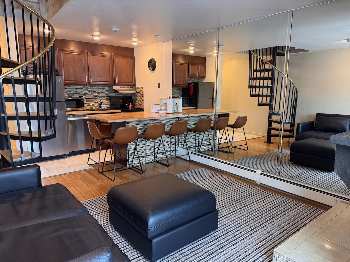 Stadt Avon Business #001456 Unsere komplett renovierte Wohnung mit 2 Betten und 2 Bädern befindet sich in einem gemütlichen Ski-Chalet-Stil am Fluss. Du wirst die Ledercouch, die bequemen Stühle und das offene Konzept mit Küche/Wohnzimmer lieben. Neue Toiletten, Fußbodenheizung und Heizlampen mit modernen Funktionen machen die Badezimmer zu einem Zufluchtsort. Die Schlafzimmer sind warm und einladend, mit Wollteppichen und verkleideten Wänden. Highspeed-WLAN, Peacock Premium, Kaffee und Tee kostenlos. Sicherheit durch elektronisches Türschloss. Schick uns eine Nachricht, falls du Fragen hast!