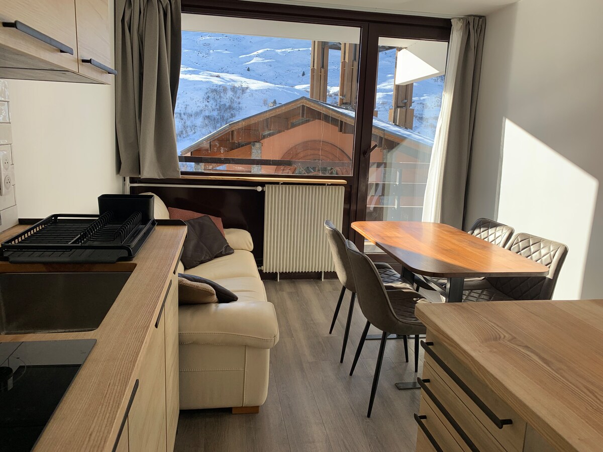 Luxuriöses 25 m2 Studio, komplett renoviert im Jahr 2022 (4 Gäste), ideal im Zentrum des Bahnhofs von Val Thorens gelegen; nur wenige Meter von allen Geschäften, Skischulen und Verleihzentren entfernt. Die Residenz befindet sich an der Hauptstraße; das Studio im 3. Stock ist jedoch auf die Berge ausgerichtet und somit durch dreifach verglaste Fenster vor dem Lärm der Straße geschützt. • ECHT direkter Zugang zur Piste • Bettwäsche inbegriffen. Die Betten sind für deine Ankunft gemacht. • WLAN • Disney+, Engl. Kanäle • Skibox
