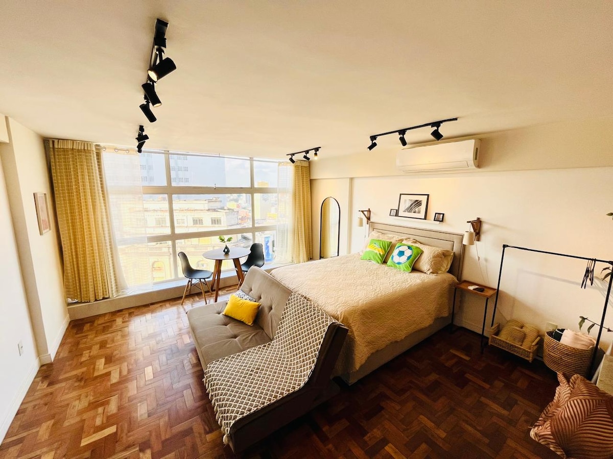 Klimaanlage + ultraschnelles Internet + Queensize-Bett. Studio-Apartment in São Paulos berühmtestem Gebäude, mit ausgestatteter Küche und zentraler Lage. Einfacher Zugang (weniger als 15 Minuten) zu: Stadttheater, 25 de Março und städtischer Markt, Fußballmuseum, Paulista Avenue, MASP, Augusta Pinacoteca, Praça das Artes, Vale do Anhangabaú, Vila Madalena. 200 m von der Metro (República).