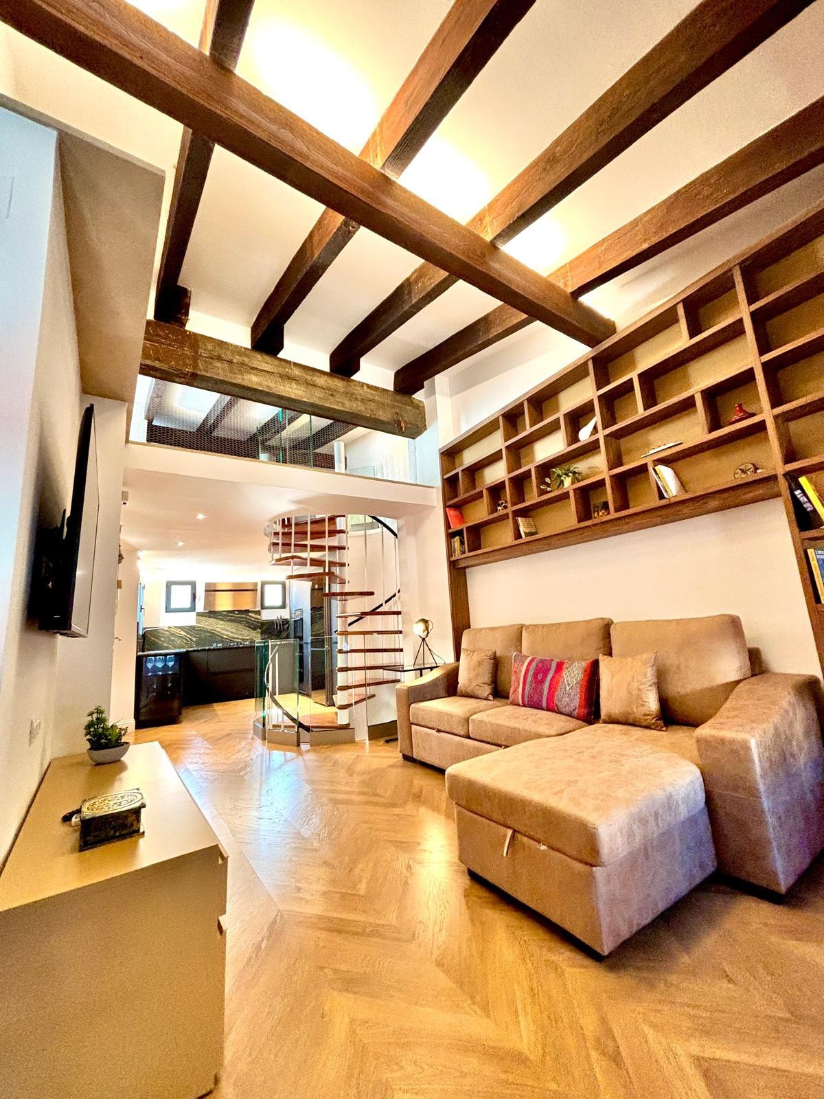 Das Loft befindet sich im Herzen des maritimen Viertels von Valencia, El Cabanyal, 5 Minuten vom Strand Malvarosa entfernt. Das Haus wurde im Jahr 1900 gebaut und komplett renoviert, ohne seine Essenz zu verlieren. Diese atemberaubende Wohnung verbindet traditionelle Architektur mit schickem Boho-Design in einer natürlichen, strukturierten Umgebung. Schau dir die hohen gewölbten Holzbalkendecken und freiliegenden Ziegelwände an, während du im Marmorküchenbereich speist und dich in der geräumigen Regendusche abkühlt.
