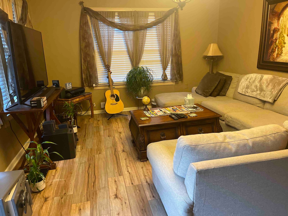Das Ferienhaus ist gemütlich und komfortabel. Es ist ein 980 Quadratfuß großes Fertighaus. Es wurde renoviert, neue Laminatböden. Der Gemeinschaftsraum und die Küche sind offen und geräumig. Neuer 50-Zoll-Smart-TV und kleinerer Schlafzimmer-Roku-TV. Geteilter Schlafzimmer-Grundriss. Hauptschlafzimmer und Bad an einem Ende. Kleineres Schlafzimmer neben dem Flurbad. Shampoo und Duschgel. Die Küche ist voll ausgestattet zum Kochen. Gewürze und Öl, Kaffeemaschine, K-Cups und 12-Tassen-Kanne, Waschmaschine/Trockner. Umzäunter Garten, haustierfreundlich. Hochstuhl und Pack n Play