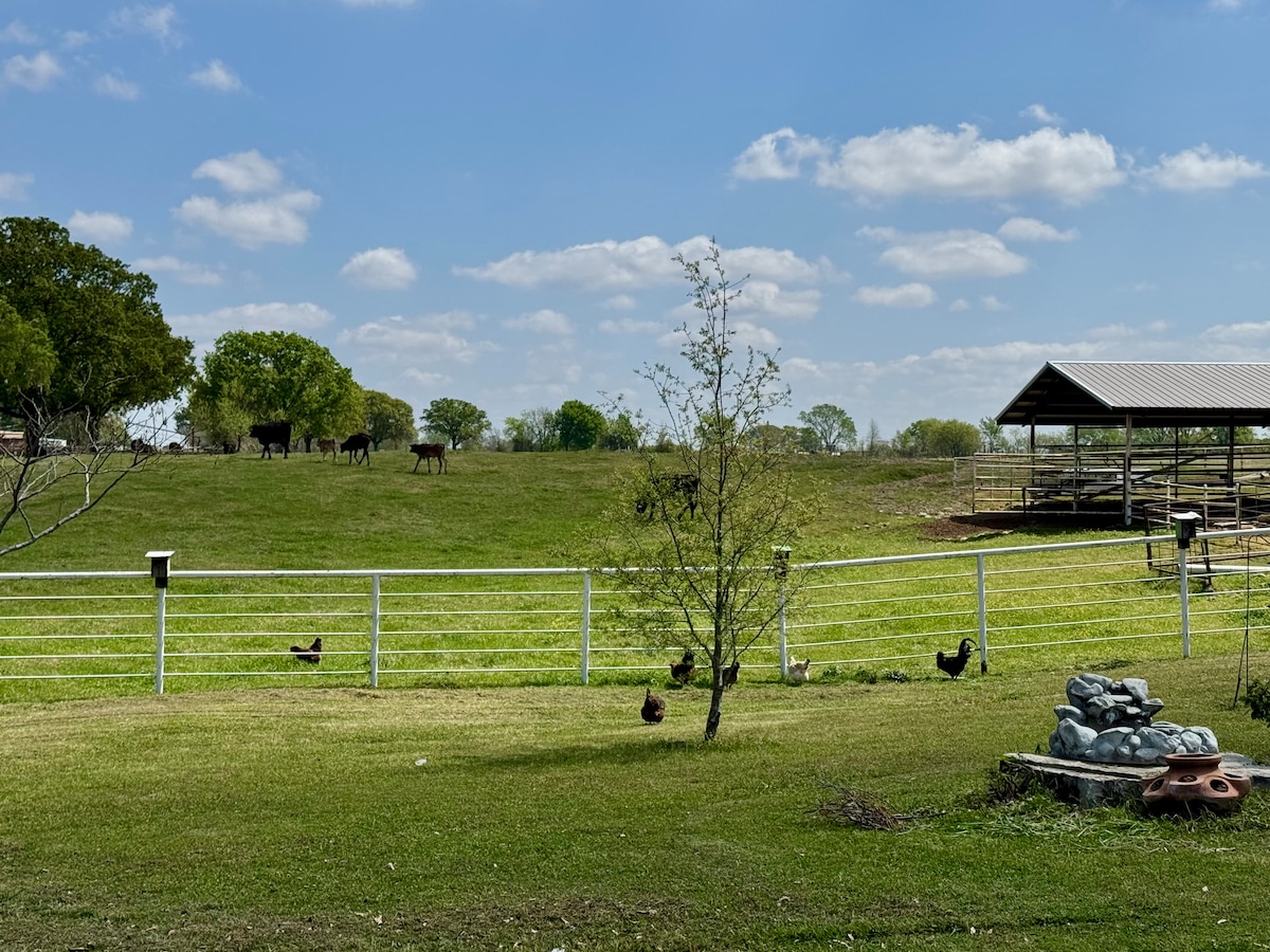 Rest and relax with Rosie (mini horse) and her mini friends (including 2 miniature Highland cows) in our cozy cabin on our 20-acre horse ranch. Wi-Fi, 2 smart TV's, washer/dryer, queen bed, twin bed and XL bean bag that folds out into a king floor bed are all provided. Enjoy the fully equipped kitchen with a full-size fridge, stove, oven and microwave. Use the gas grill on the covered front porch that looks out onto Rosie's pasture. Bring your fishing poles to catch some fish in the pond.