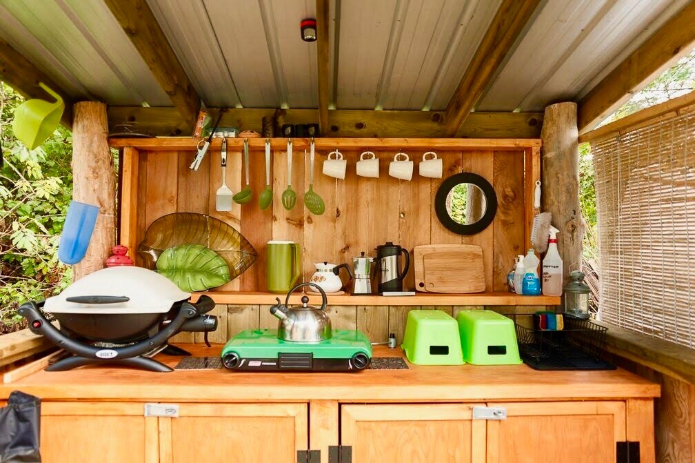 Einzigartiges Segeltuchzelt unter einer Zedernpfostenstruktur mit allen Annehmlichkeiten, die du für ein „nicht so grobe“ Erlebnis benötigst. Licht wirft tanzende Schatten entlang des Zeltes, während du dich in ein Kingsize-Bett mit Bambus, Leinenwäsche und Federdecken legst. Es gibt zusätzliche Wolldecken, in die du dich einwickeln kannst, während du auf dem überdachten Deck sitzt, um die Sterne zu beobachten und nach einem Tag voller Abenteuer zu entspannen und dem Rauschen der Wellen zu lauschen, während du eine Tasse Starbucks-Kaffee aus der Nespresso-Maschine genießt.