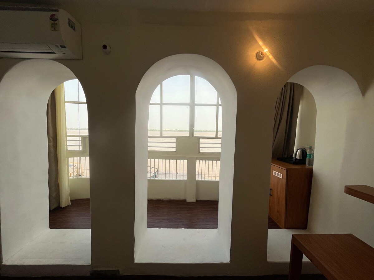 Erlebe dieses wirklich einzigartige Penthouse in der heiligen Stadt Benares! Das Haus verfügt über eine atemberaubende Architektur und eine ästhetische Innenausstattung, die eine Verschmelzung von Farben aus Griechenland und Inspiration von den Ghats von Benares schafft. Die Terrasse ist so gestaltet und beleuchtet, dass sie für Social-Media- und Fotografie-Enthusiasten geeignet ist. Was gibt es noch? Es hat ein Originalboot vom Ganges, sodass du die Aussicht genießen und dich entspannen kannst, während du dem Wasser aus dem handgefertigten Bambusbrunnen lauschst.