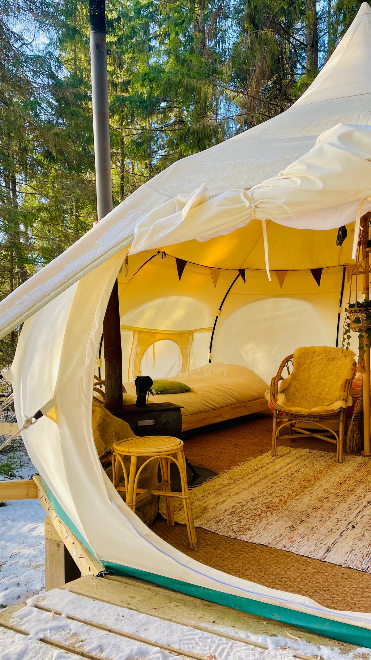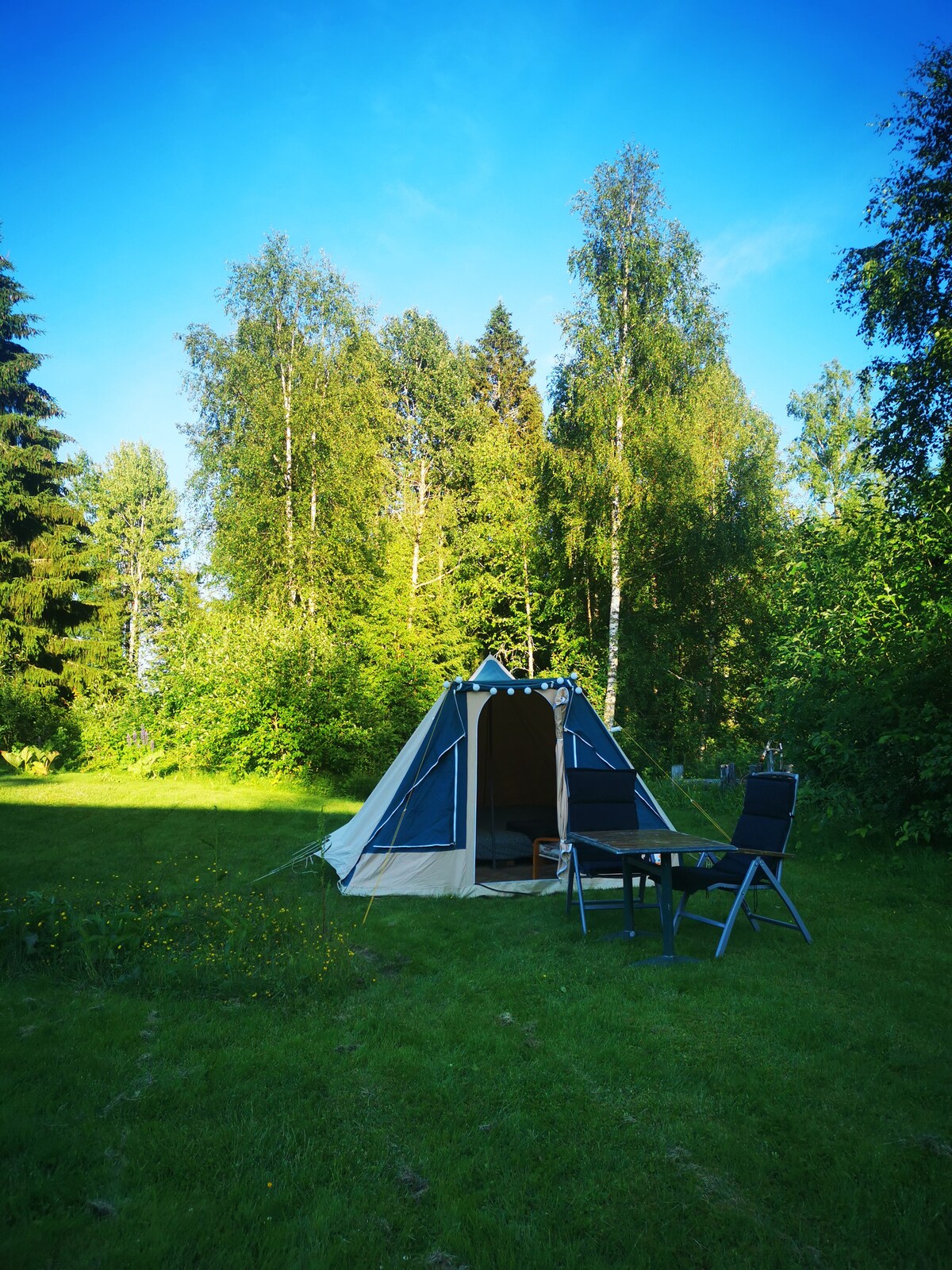 This cozy and comfortably furnished tent can be found in the garden of our house on a remote hill in the Swedish forests. With a lake within walking distance, you can relax here for a few days. There is electricity and drinking water in the tent, a chemical toilet in the small building next to it and an outdoor shower behind the building. Bed linen and breakfast can be booked as well. We have also a canoe and multiple SUPs for rent.
