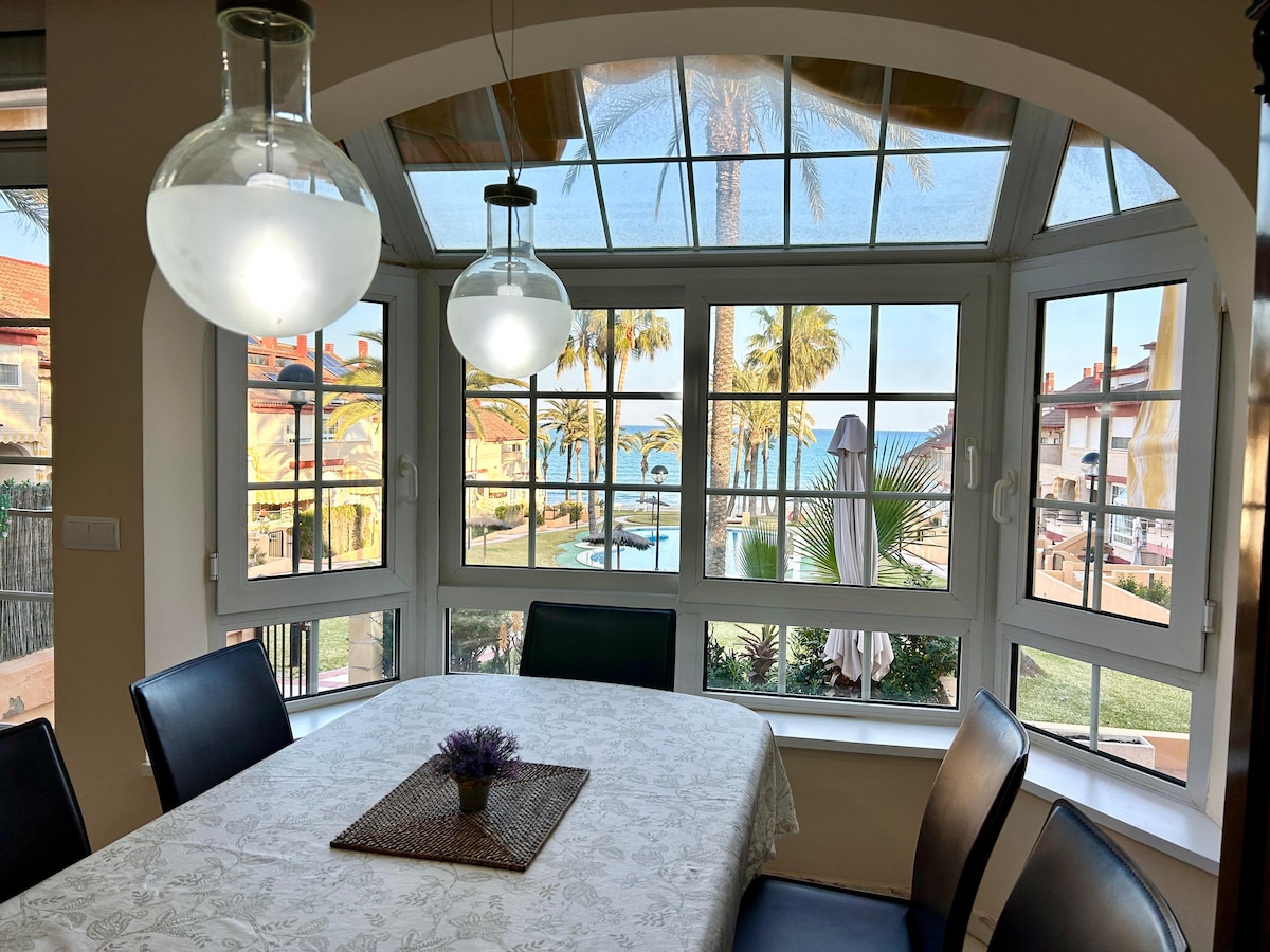 Haus in erster Linie mit Meerblick und Parkplatz. Gesamte Unterkunft 8 Reisende: 4 Doppelschlafzimmer mit AA (Kalt-Wärme) und 1,35 m Betten, Wohnzimmer mit Schlafsofa, 1 Badezimmer mit Badewanne, 2 Badezimmer mit Dusche und 1 WC. Arbeitsbereich Glasfaser und WLAN im gesamten Gerät. Toller Blick auf den Ozean und Urbanisation. Fantastische Lage: Erste Linie mit Blick auf das Meer in Playa de Muchavista. 190 m ² verfügbar vom Haus auf 4 Etagen. 10.000 m2 Urbanisation mit Pool, Sportbereich, Grill und Gärten.