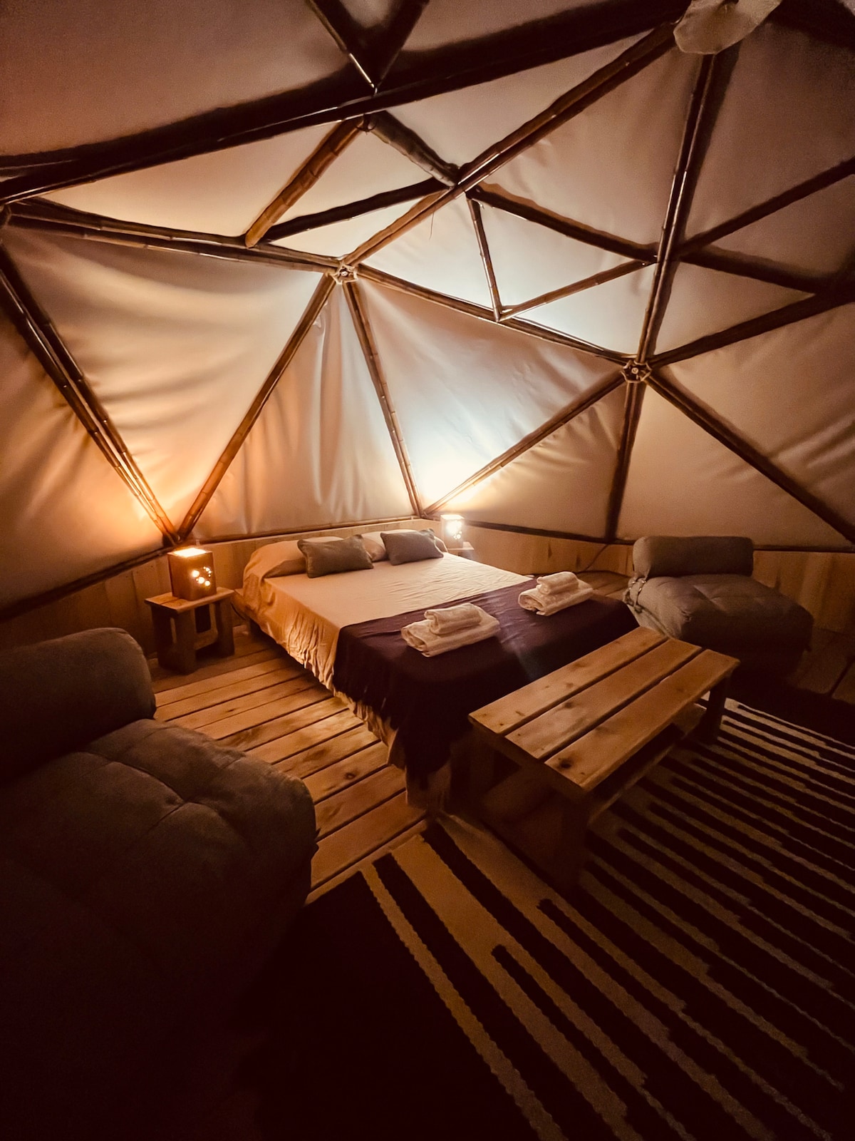 Es una casa tipo loft rústica de amplios ambientes integrados, en el entrepiso cuenta con una habitación de 7 metros por 3 con un sommier de dos plazas (queen size) y dos camas chicas con buenos colchones. Su mayor atractivo es un ventanal de 4 metros de largo por 2 de alto con una vista inmejorable a grutas de salamanca y sierras de sosa. La casa está construida en un valle con un área total de 12 hectáreas. Nuestras estadías son de 30 hs. Check in 11 hs. Check out 17 hs.