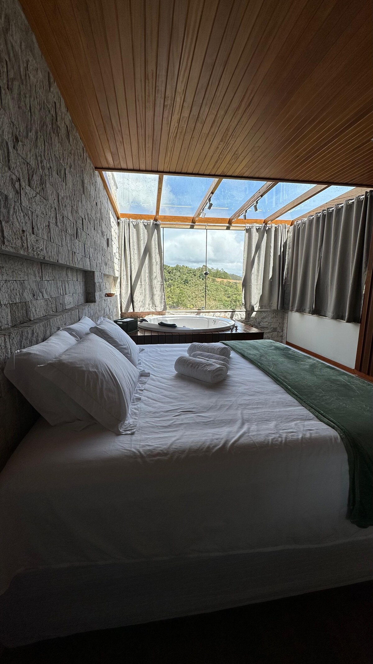 Mátria ist ein Refugium für Paare, die ein sinnliches und anspruchsvolles Erlebnis inmitten der Natur suchen. Die Hütte kombiniert originelle Architektur, einen Kamin, ein Kingsize-Bett mit hochwertiger Bettwäsche, eine Badewanne mit Blick auf den Wald und eine hängende Terrasse in den Bäumen. Jedes Detail wurde so gestaltet, dass es ein einzigartiges, intimes und unvergessliches Erlebnis schafft. Das Hotel liegt in Pedra Azul, nur wenige Minuten vom State Park entfernt. @matriapedraazul