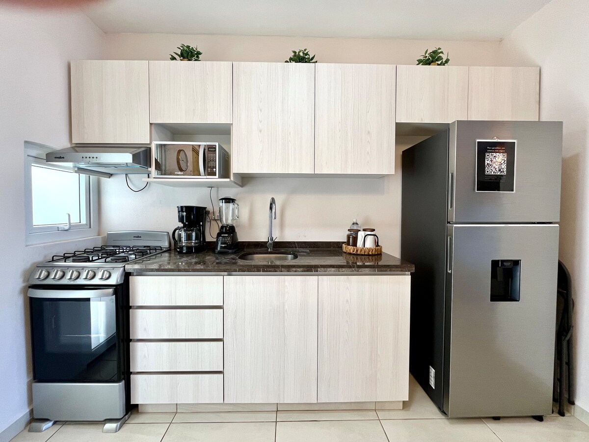 Erdgeschosswohnung, klimatisierte Zimmer, umgeben von Touristenattraktionen, Restaurants, Einkaufszentren, Museen, 3 Minuten von den Stränden und 2,5 km vom Aquarium von Veracruz (einen Block vom Karneval und Marathons entfernt) - Haupt- und Esszimmer mit Smart-TV, voll ausgestattete Küche mit Blick auf einen kleinen privaten zentralen Garten. - Hauptschlafzimmer mit einem Kingsize-Bett, Badezimmer, Ankleideraum und Smart-TV. - Sekundärkamera mit Doppelbett und Kleiderschrank. -Garage für ein Auto mit einer elektrischen Tür.