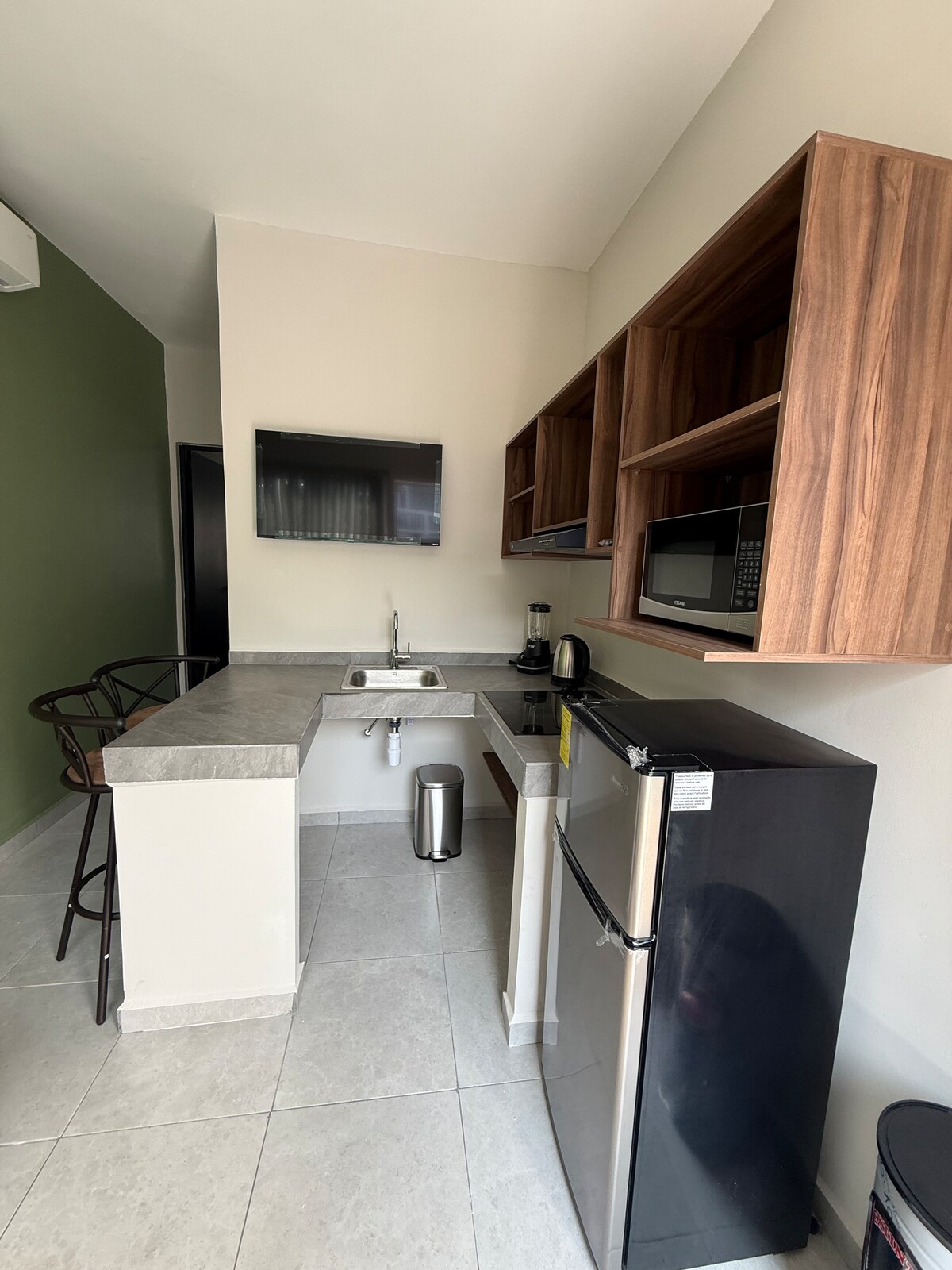 Disfruta la comodidad de nuestra Suite Premier: amplia, moderna y completamente nueva. Incluye recámara con cama Queen de calidad, cocina integral equipada, baño privado y detalles pensados para tu bienestar. Ideal para estancias de trabajo o descanso, con WiFi rápido, Smart TV y un ambiente elegante y acogedor.”