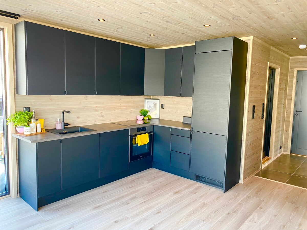Dies ist ein neu renoviertes und luftiges Tiny House mit einem Doppelbett, einer Küche mit Essecke, einem Kleiderschrank, einem Badezimmer und einem Schlafhaus. Es gibt kostenlose private Parkplätze auf dem Grundstück. Zentrale Lage mit geschäftlicher und öffentlicher Kommunikation in der Nähe. Kurzer Weg zum Fjord mit Strand, Essbereichen und Wandergebieten. Guter Ort auch für Familien mit großen Kindern / Gesellschaft von bis zu vier Personen, von denen zwei mobil genug für die Treppe bis zum Schlafhaus sind. Private Terrasse und Zugang zum üppigen Garten in den Sommermonaten.
