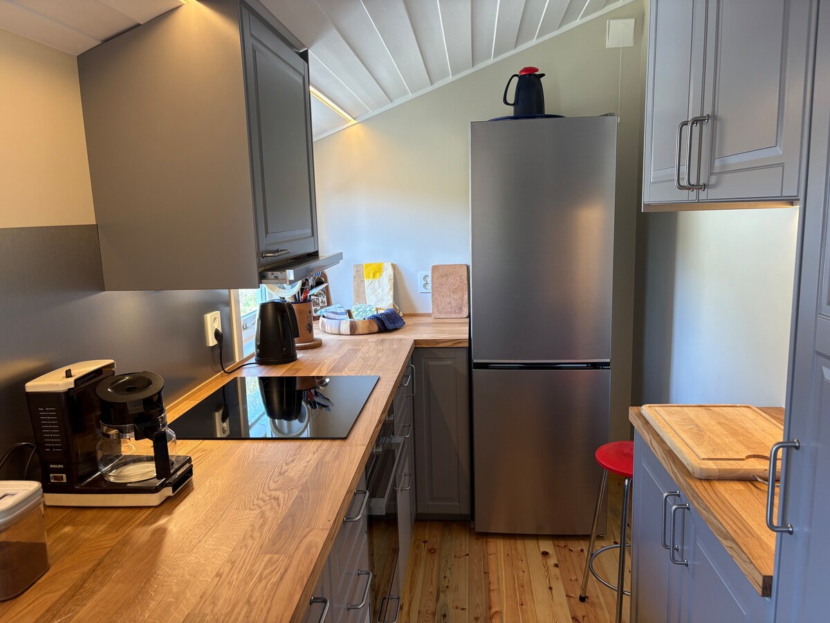 Lys og trivelig 1-roms leilighet med kjøkkenkrok. Inneholder dobbeltseng og sovesofa. Kjøkkenet har kjøleskap/fryseskap, koketopp, stekeovn, mikrobølgeovn og oppvaskmaskin. Stort og lyst flislagt bad med gulvvarme. Inneholder toalett, servant og dusjhjørne. Leiligheten ligger i garasjebygg på bakkeplan. Egen terrasse med sol på ettermiddagen. Det finnes også mulighet for å leie en grillhytte som finnes på eiendommen. Har 2 sykler som er mulig å leie (5EUR per dag) Gode parkeringsmuligheter.
