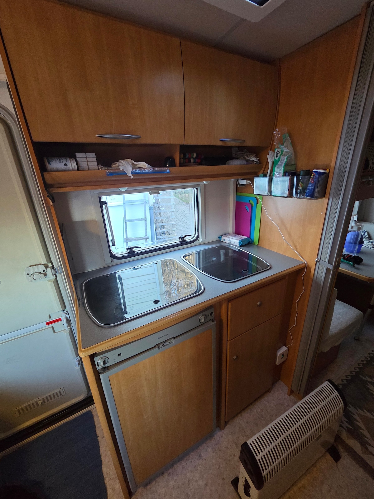 Wohnwagen mit 5 Betten im Hof eines Einfamilienhauses. Parken in der Einfahrt. Ein Doppelbett, ein Einzelbett und zwei Etagenbetten. Am besten geeignet für 2 Erwachsene und bis zu 3 Kinder. Nur das Doppelbett ist in voller Länge. Etagenbetten können nur von Kindern genutzt werden. Einfach ausgestattete Küche mit Gaskochfeld, kleinem Kühlschrank und Airfryer. Normale, kleine Toilette. Keine Möglichkeit zum Duschen. Es gibt hier Luxus, aber eine einfache und erschwingliche Unterkunft für ein oder zwei Nächte. Am besten geeignet für Kurzaufenthalte.