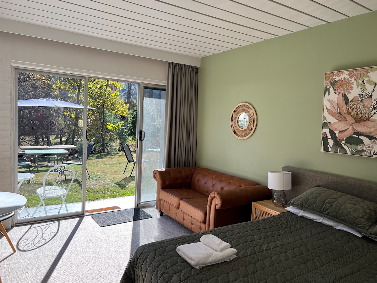 Located 200 metres from Bright shops and restaurants and backs onto the Ovens River and Canyon Walk. Our charming ground Queen rooms opens onto our private garden with seating available and our upper level have a private balcony that looks out over our garden and the Ovens River. If a Queen Room is unavailable, we allocated our guests to a Twin Share room. The only different is we have swapped out the couch for a single bed. If you would not like this, please let us know prior to your stay.