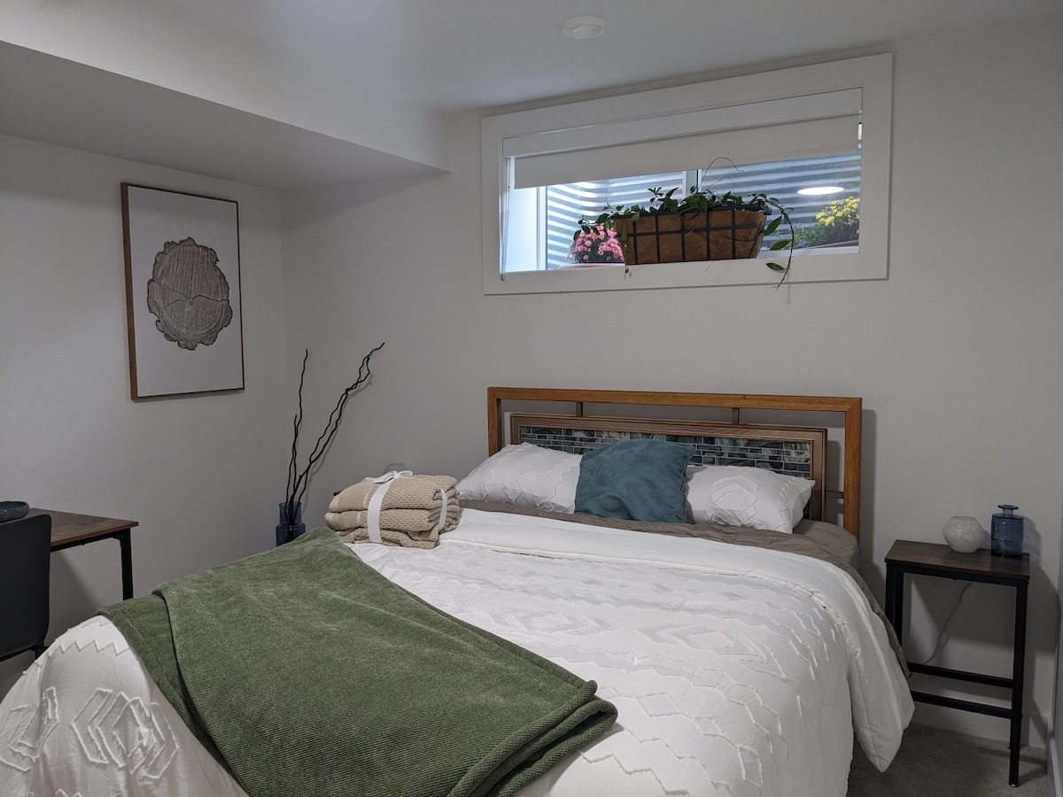 Gemütlicher Raum auf der unteren Ebene mit Meerblick, eigenem Eingang und Terrasse. Ideal für Paare. 5 Minuten von den Stränden der Cordova Bay, Elk Lake, Mattick's Farm, Gigis Deli & Markt, Adrienne's Restaurant, Cordova Bay Golf Course, Mount Douglas & mehr entfernt. 15 Minuten von der Fähre und der Innenstadt (mit dem Auto). Genieße ein Kingsize-Bett und ein Zweisitzer-Sofa zum Fernsehen. Der Zweisitzer-Sofa ist nicht groß genug, um darauf zu schlafen. Bitte informiere mich über alle Frühstückspräferenzen. *Bitte beachte, dass der Raum viele Treppen hat, um zum Haus zu gelangen.