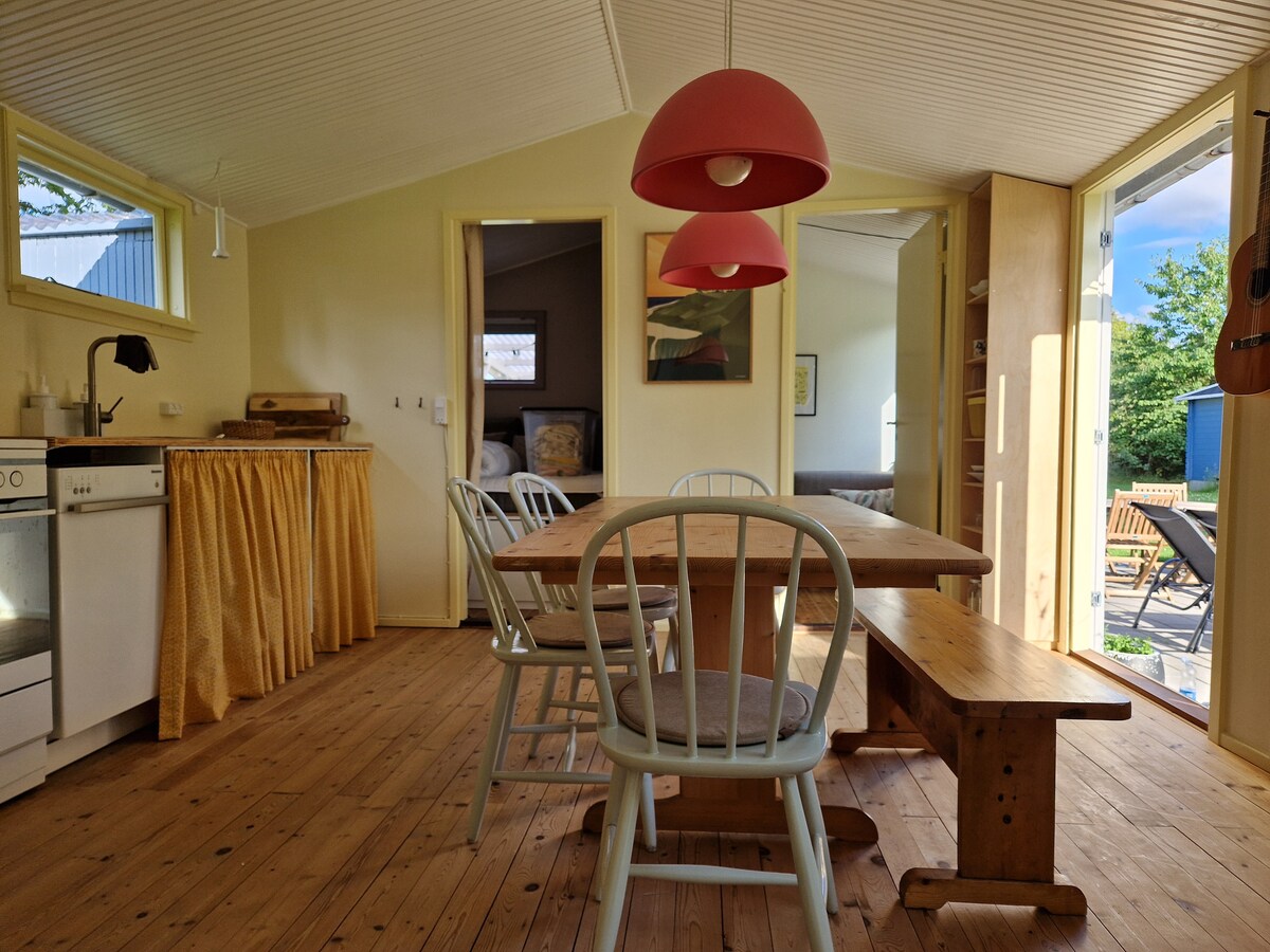 Willkommen in Lyngen! Hier ist es ein 10-minütiger Spaziergang zu einem der schönsten Sandstrände Dänemarks, einem abgelegenen Grundstück, das von Bäumen umgeben ist, einer Feuerstelle zum Versammeln und einer Markise, um Schatten zu suchen. In unserem kleinen Haus gibt es hohe Decken, ein gemütliches Loft, das du als Schlafbereich oder Lesehöhle dekorieren kannst und es gibt alles, was du für Komfort benötigst; Waschmaschine, Geschirrspüler, Warmwasser, Wärmepumpe, Kamin, TV, Chromecast, Internet und viele Brettspiele und Rätsel für regnerische Tage