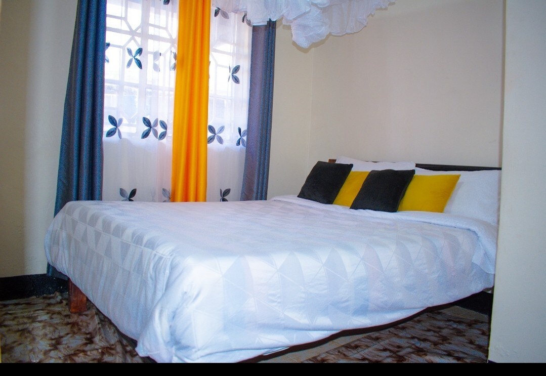 Eine moderne Wohnung mit einem Schlafzimmer, modernen Möbeln und einer voll ausgestatteten Küche, die dir das Gefühl eines „zweiten Zuhauses“ gibt. Egal, ob du dich im Wohnbereich entspannst und die neueste Unterhaltung auf Smart-TV streamt, während du dir deine Lieblings-Netflix-Show ansiehst oder dich auf den gemütlichen Betten mit luxuriöser weißer Bettwäsche ausruhen möchtest, du wirst dich in alles verlieben, was die Wohnung zu bieten hat. Nur 2 km vom zentralen Geschäftsviertel von Kisumu entfernt.