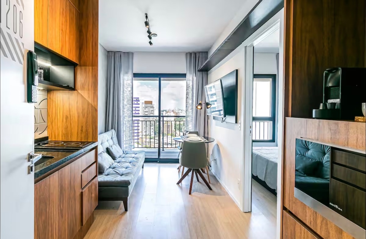 A 300 do metrô V. Madalena, perto de restaurantes, lojas, bares e espaços culturais. Cama de casal super confortável, A/C, internet, SmarTV 42", bancada grande para trabalho, mesa para refeições, decoração estilosa, janelas retráteis com muita luz natural e vista da cidade. Cozinha compacta conta com mini refrigerador, cooktop elétrico de duas bocas, filtro de água, sanduicheira e liquidificador e utensílios de louça. Piscina climatizada, academia, lavanderia e mini-loja de conveniência.