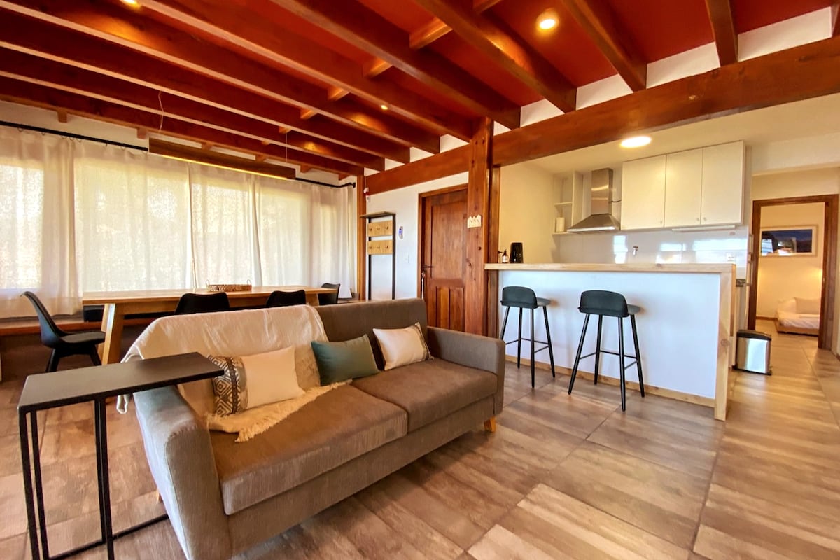 Gemütliche 50m2 Wohnung in strategischer Lage und natürlicher Umgebung. Sie verfügt über eine moderne Dekoration, die mit typischen patagonischen Details kombiniert wurde. Der Panoramablick kann von allen Räumen aus genossen werden. Geräumige und funktionale Küche, integriert im Wohn-Esszimmer. Komplettes Badezimmer mit Badewanne. Privatzimmer mit Queensize-Doppelbett (1,6 m breit) und großem Kleiderschrank. Das Schlafsofa im Wohnzimmer bietet die Möglichkeit, zwei Einzelbetten oder ein Doppelbett zu machen. Balkon mit Tisch und Stühlen.