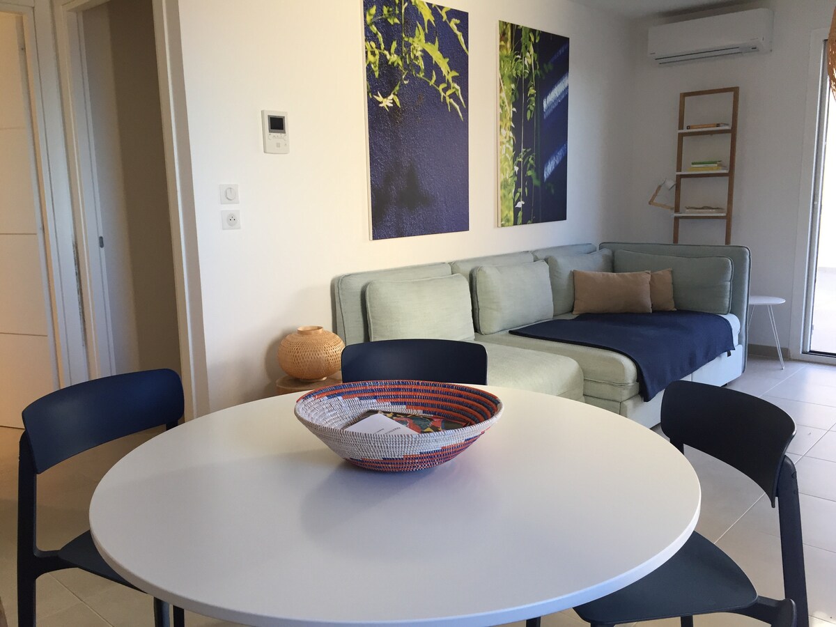 Gemütliches Studio, gemütliches Nest in Saint-Florent, perfekt für einen romantischen Kurzurlaub. 1,5 km von den Stränden und dem Stadtzentrum entfernt, in der Nähe des Hafens für Bootshuttles zur Agriates-Wüste und zu seinen himmlischen Stränden. Private Terrasse für Mahlzeiten für zwei Personen, bequemes Bett, ruhige Residenz mit Pool und Garten, Parkplatz. Eine intime Umgebung zwischen Meer und Natur, ideal, um Sonnenuntergänge zu genießen und die Schönheit Korsikas zu zweit zu erkunden, mit Spaziergängen, Entspannung und lokalen Entdeckungen.