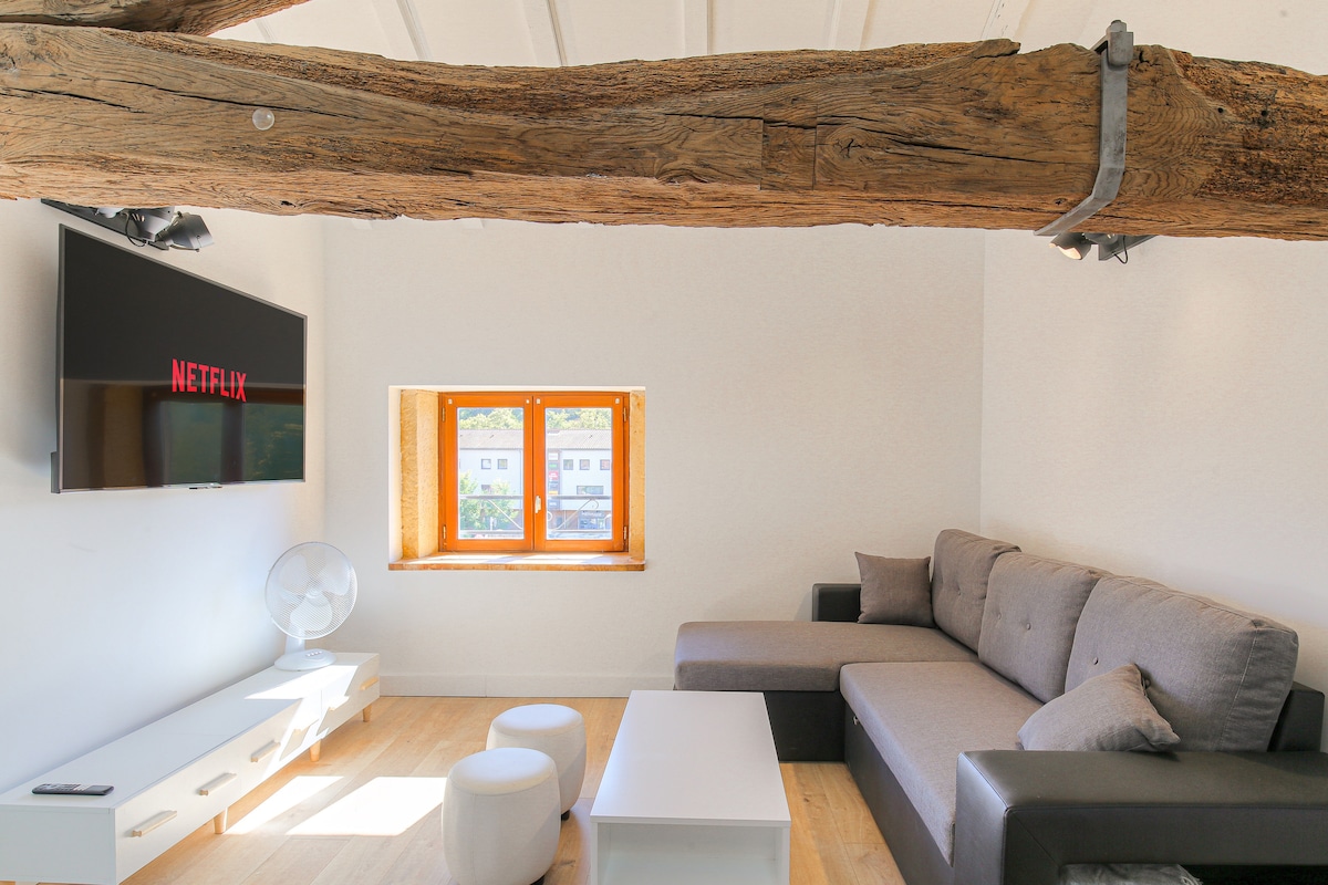 Petit havre de paix situé au cœur du Beaujolais dans une ancienne maison vigneronne. Profitez d'un cocon avec vue sur les vignes depuis votre terrasse, d'un parc arboré et fleuris de 5000m². Il est entièrement indépendant et voisin de la maison des propriétaires. Atelier Ornela juste a côté du gîte . Nous sommes à 8 min de l'A6. Idéal pour une pause en famille ou pour un séjour professionnel. A 10 min de Villefranche-sur-Saône (centre ville piéton le plus dynamique de France ) A 30 min de Lyon.