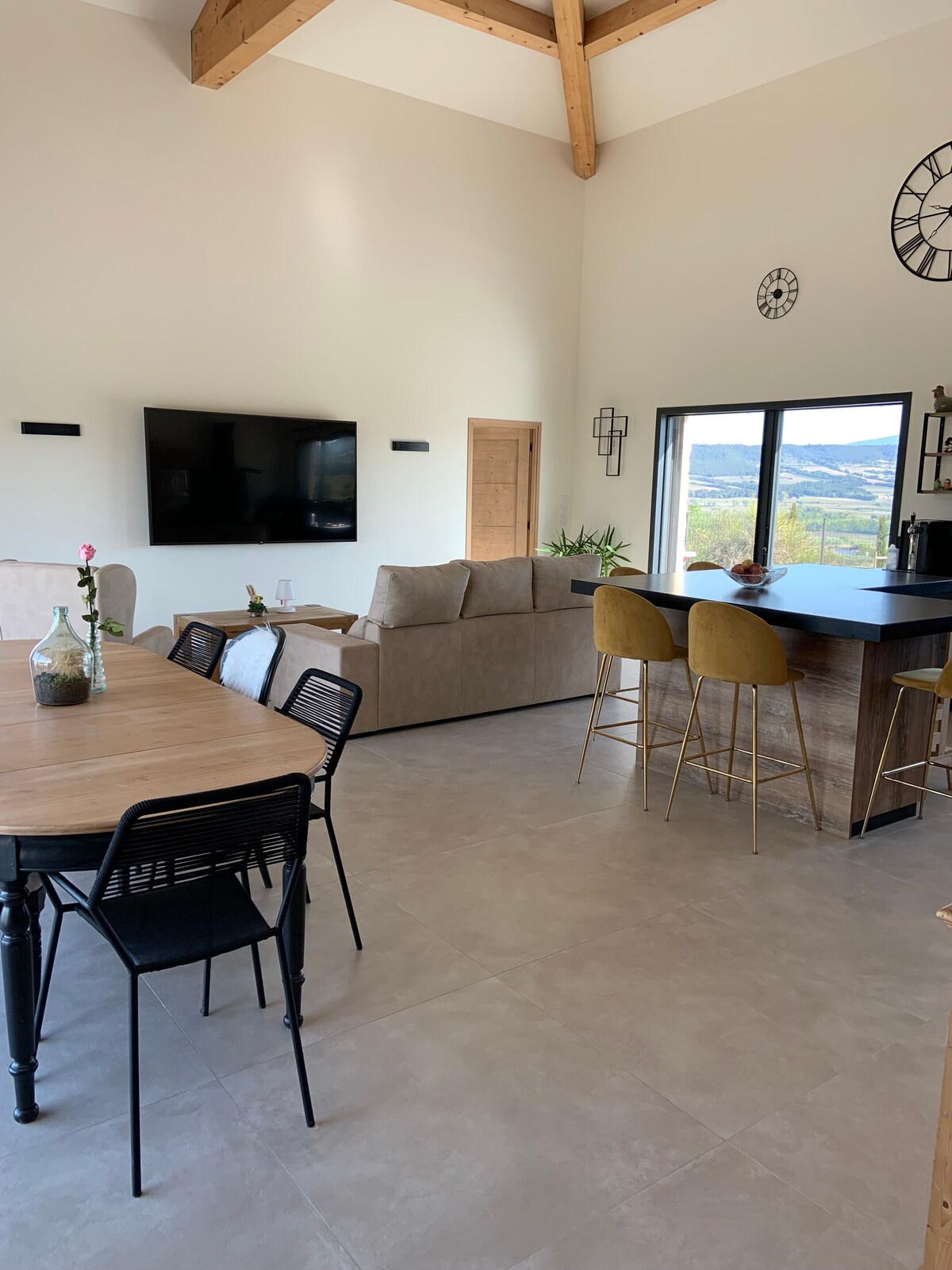 Im Herzen des Dorfes Villedieu, in der Nähe des Platzes mit jahrhundertealten Platanen, ist unser klimatisiertes Haus mit einer tropischen Terrasse, einer sehr großen Garage und 3 große Doppelzimmer (neue Betten) • Rosmarin (Bett 140 cm) • Jasmin (Bett 180 cm oder 2 Betten 90 cm)+Dusche+Waschbecken • Cyprès (Bett 160 cm) • 1 Badezimmer + WC und 1 WC mit Waschbecken auf halbem Weg Ein großes, lichtdurchflutetes Wohnzimmer. 130 m² komplett renoviert mit WLAN. Bettwäsche und Handtücher sind inbegriffen.