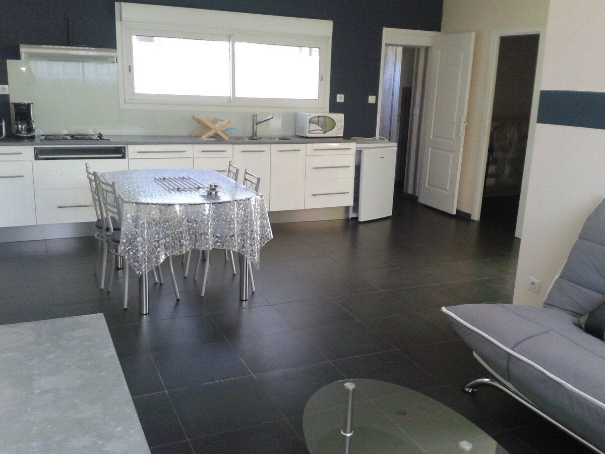studio calme de 35 m2 + mezzanine de 12 m2 ( pour enfants) climatisé avec piscine encadrée d'une grande terrasse et salon de jardin ,espace jacuzzi ,terrain de pétanque et table de ping pong + grand terrain, parking sécurisé . Cuisine équipée, plaque électrique, réfrigérateur combi, micro onde-grill, lave linge, cafetière, grille pain et nécessaire de base pour cuisine. Espace nuit en rez de chaussée avec lit en 160, TV chaines TNT - Wifi inclus. Usage exclusif de la piscine et jacuzzi accordé.