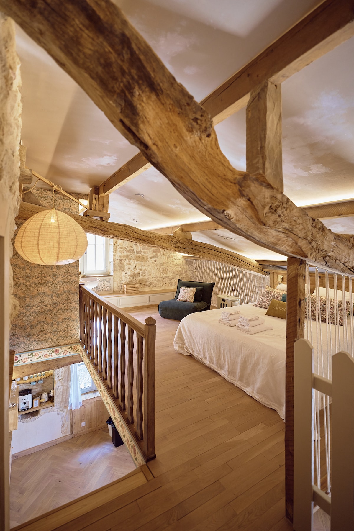 Venez vous ressourcer et vous retrouver seul ou en duo dans ce cocon de 80m2 entièrement rénové, situé au cœur du joli village ancien de Gensac en Gironde, avec une vue imprenable sur la vallée où vous pourrez admirer le soleil couchant. Vous serez conquis par son charme suranné, sa déco atypique et soignée et son confort incomparable. Un petit-déjeuner "à la française" vous est offert pour votre première nuit !