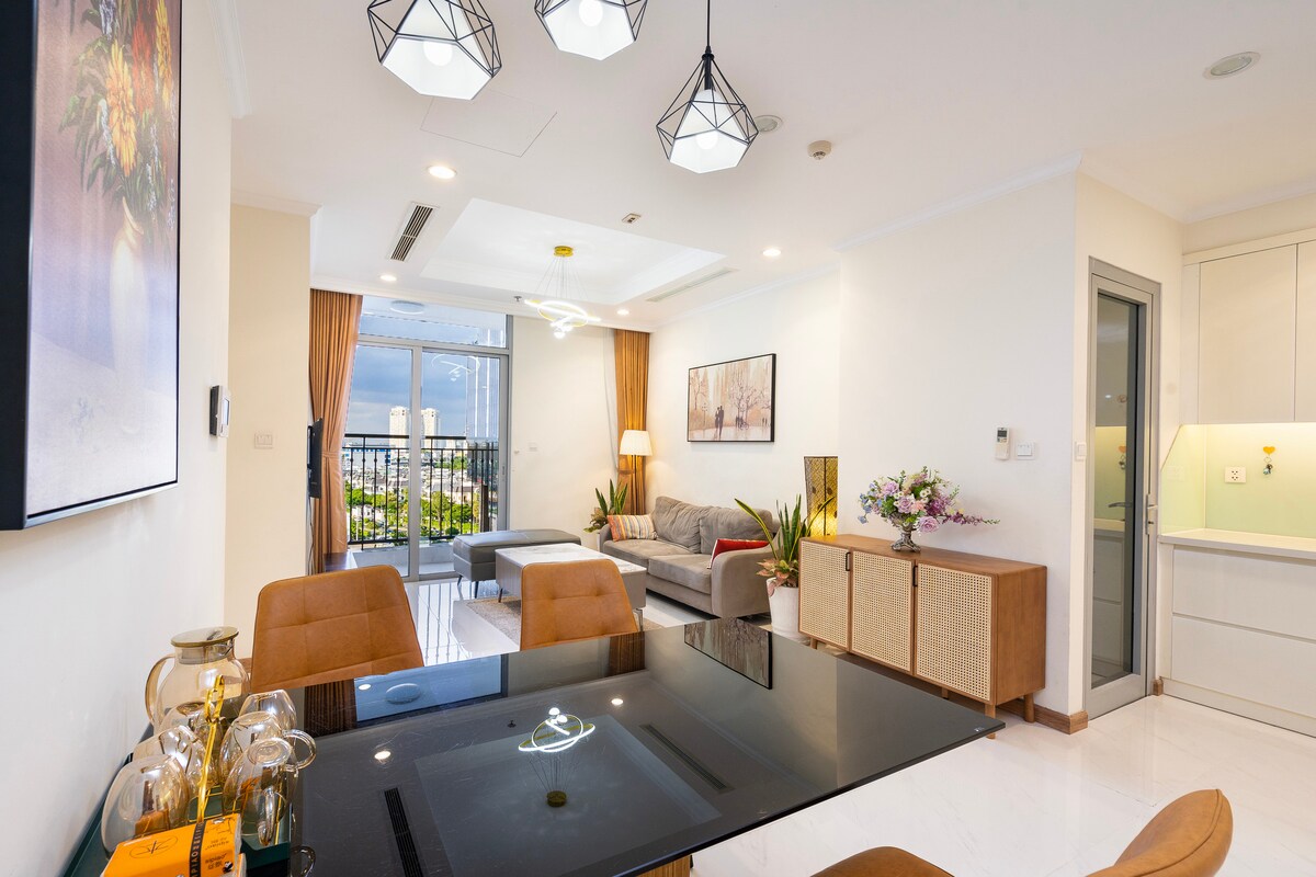 Luxury 5* The Opera Residence Corner Apartment by ChiHome - River View Bason District 1, The LandMark 81, The Galleria, The Mett Office, District 2 Sala Thiso Mall. - Tower B, Scala, Ebene 1x Einheit 10 - Größe: 70 m ² (Eckeinheit) - Enthält 2 Schlafzimmer, 2WC, komfortabel für einen Aufenthalt von 2-4 Personen. - 65-Zoll-Smart-TV mit Netflix und YouTube. - Sofa, Sessel, Teetisch. - Esstisch 4 Stühle - Komplette Kochutensilien - Highspeed-WLAN verfügbar • Klimaanlage für das gesamte Haus - Zugang zum Gebäude täglich rund um die Uhr