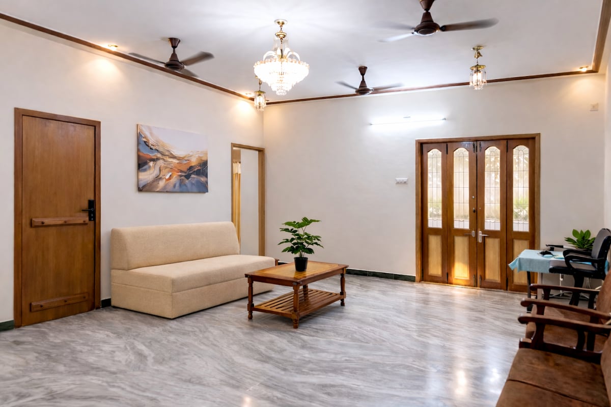 Cozy and modern 3BHK Airbnb just 2.5 miles from Madurai Railway Station🚉 Perfect for an enjoyable stay. 🏡 Fully furnished, 3 spacious bedrooms🛌with washing machine, fridge, fully equipped kitchen. Home has 8 ceiling fans🪭Has RO water🚰,iron box, exhaust fan, laptop work table, dining table, water heater, WI-FI🛜 a swing !__! Home has neem trees in all 3 sides. 🌳 Secure car parking. 🅿️ Living room and one bed room have smart TVs.📺 Flexible check-in &check-out time