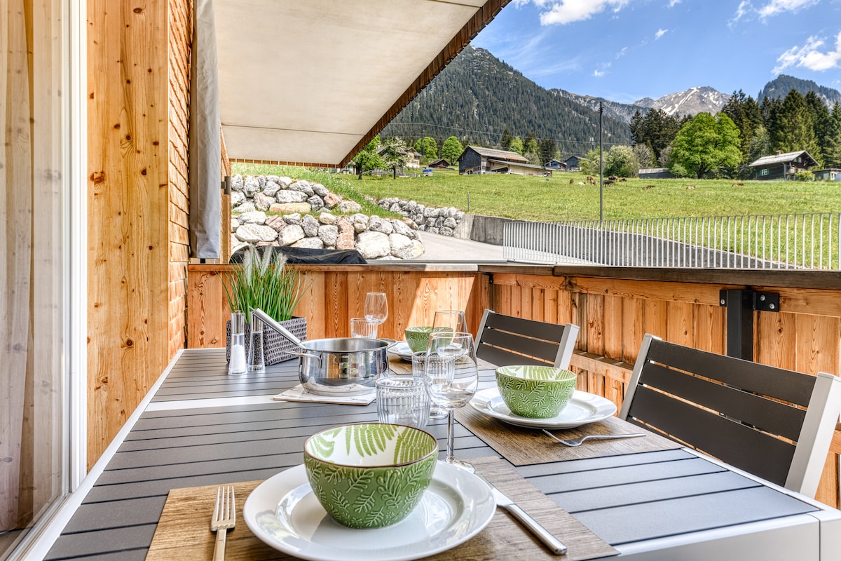 Rössle Appartements In unserem neuen, modernen und regional erbautem Holzhaus in Faschina warten 5 unterschiedliche Typen mit wunderbaren Aussichten in die Bergwelt des Großen Walsertales auf Sie. In den allergikerfreundlichen Appartements mit gemütlicher Ausstattung lässt es sich herrlich entspannen und vom Alltag abschalten. Wenn Sie bei uns in einem der unterschiedlichen Appartementtypen urlauben können Sie auch ein regionales Frühstücksbuffet in unserem schönen Frühstücksraum buchen.