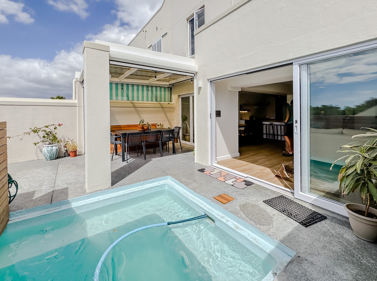 Dieses bescheidene, wunderschön strukturierte und farbenfrohe Haus liegt auf den Tamboerskloof-Hügeln mit Blick auf die City Bowl und bietet eine kühle, ruhige Zuflucht vor dem Trubel der Stadt. Wenn du unter den riesigen Zitronenbaum trittst, am kleinen, sonnenverwöhnten Tauchbecken vorbei und durch die antike, mit Nieten besetzte Tür gehst, wirst du dich fühlen, als wärst du gerade aus einem marokkanischen Küstendorf gerissen worden, komplett mit Mosaikfliesen, gewebten Deckenmatten und rohen Steinwänden. Beide Schlafzimmer und der gesamte Wohn- und Küchenbereich öffnen sich separat durch große Türen zu den Außenbereichen, die durch den Schatten der Bäume gekühlt werden. Hier ist deine Oase!!! Gäste haben vollen Zugang zur Unterkunft. Ich wohne in der Nähe und bin immer erreichbar, falls du etwas brauchst. Diese Unterkunft befindet sich in einer angesagten Gegend an der Seite des Signal Hill. Gleich um die Ecke befindet sich eines der ältesten Delikatessengeschäfte der Stadt, das derzeit The Blue Café heißt. Schlendere bergab, um schnell eine Ansammlung von Restaurants, Bars, Delis und Einkaufszentren zu erreichen. Uber ist die einfachste und günstigste Fortbewegungsmöglichkeit. Das Haus selbst liegt ziemlich weit oben auf einem steilen Hügel, sodass das Gehen von der Bushaltestelle (vor allem mit deinen Einkäufen) anstrengend sein kann. Wenn du dein eigenes Auto hast, gibt es Platz für ein normal großes Auto im Garagenbereich. Müllabfuhr – der LKW kommt jeden Donnerstag zum Einsammeln. Ich würde die Gäste bitten, den großen Mülleimer vor 8:00 Uhr morgens auf die Straße zu rollen. Bitte stelle den Mülleimer nicht am Vorabend raus.