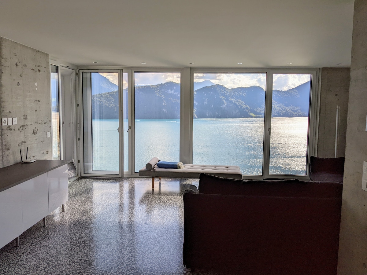 Private Suite auf der Villa mit Zugang zum privaten Seeufer. Grossartige Aussicht Sonnenaufgänge. Die meisten touristischen Highlights sind unter 1 Stunde entfernt. Grosszügiges Schlafzimmer (mit Home Cinema), Panorama Lounge, Panoramaküche, Bad - alles privat genutzt. Bei 3-5 Personen wird ein weiteres privates Schlafzimmer/Bad zur Verfügung gestellt (eine Etage tiefer via Lift). Zugang zu See und Garten. Kinder sind möglich, nur Kleinhunde. Parkplatz, Wifi. Das beliebteste Airbnb der Schweiz.