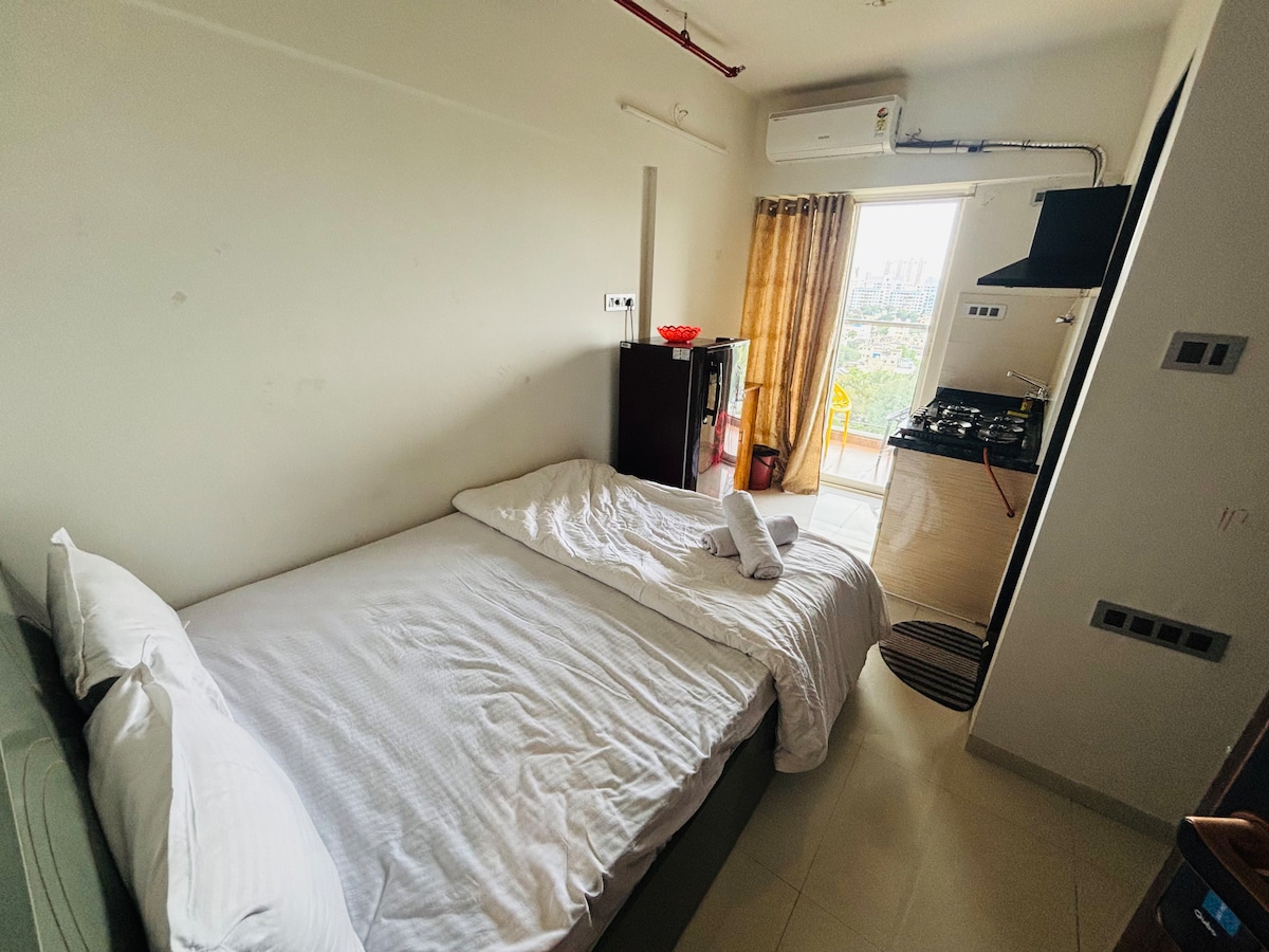 Cozy stunning Modern studio in Gera’s World of Joy, Kharadi, just minutes from Barclays, EON IT Park & WTC. Enjoy a cozy queen bed, smart TV, Wi-Fi, AC, and a compact kitchenette with balcony view. Ideal for business or leisure stays, with 24x7 security and quick access to cafés, malls, and Pune Airport. A perfect blend of comfort, style, and convenience in Pune’s IT hub.