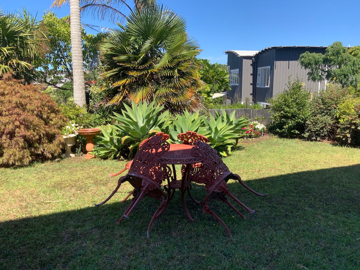 Near new property under our home, wicked sea views and lots of garden, 2 mins from the beach walking, to shops, bars and cafe's. Wheel chair accessible. There is a double bed and single swab for the floor if needed. plus, a double bed couch in the lounge. We have bassinet for small children Coffee and tea provided with full washing machine & kitchen. WiFi included. is fully catered for with everything you need. TV for your entertainment. Easy bus ride to Auckland City if you need too.