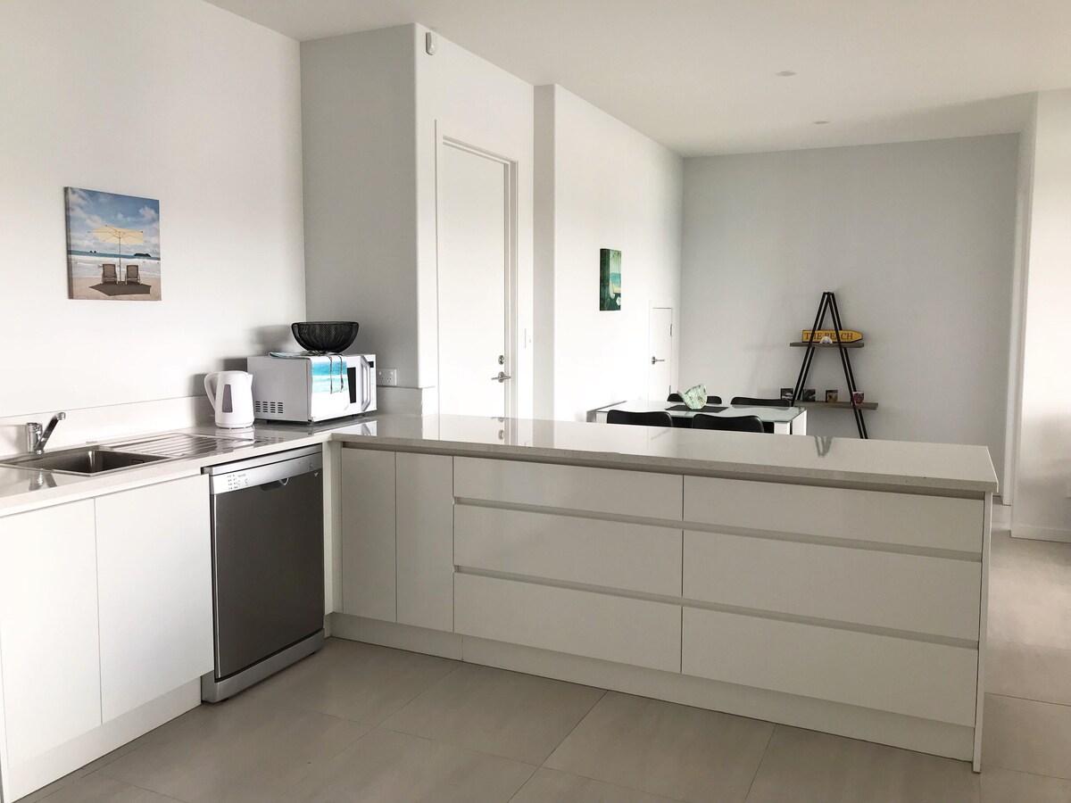 Eine luftige, moderne Wohnung am Strand, Baujahr 2018, mit herrlichem Meerblick und nur 2 Gehminuten vom Strand über einen privaten Gehweg entfernt. Genieße den atemberaubenden weißen Sand und die rollenden Wellen von Langs Beach oder spaziere auf den Panorama-Küstenwegen in der Nähe. Diese unabhängige Wohnung befindet sich am Ende der Bucht von Langs Beach und im ersten Stock eines neu gebauten Ferienhauses, ist aber komplett privat und perfekt für einen Kurzurlaub für Paare oder eine Familie oder eine Gruppe von vier Personen.