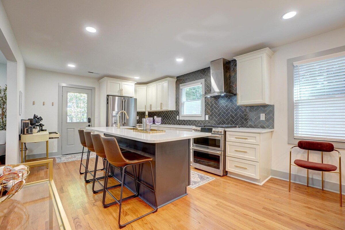 Schaffe unvergessliche Erinnerungen in diesem geräumigen, wunderschön gestalteten Haus für dich + 9 Gäste! Perfekt für Familien treffen, Sportveranstaltungen und besondere Anlässe. Das Hotel liegt im Herzen der Innenstadt von Durham, nur 4 Minuten von Duke, Bulls Stadium, DPAC und Tobacco Trail entfernt. Mach es dir an der Feuerstelle gemütlich, genieße einen Grill oder entspanne dich mit frischem Popcorn und Schallplatten. Zieh dich in luxuriöse Betten + Bettwäsche zurück und besuche die Gourmet-Kaffeebar am Morgen. Kostenloser Zugang zum nahe gelegenen Fitnessstudio mit Pool. 4 Luftmatratzen und EV-Ladegerät verfügbar.