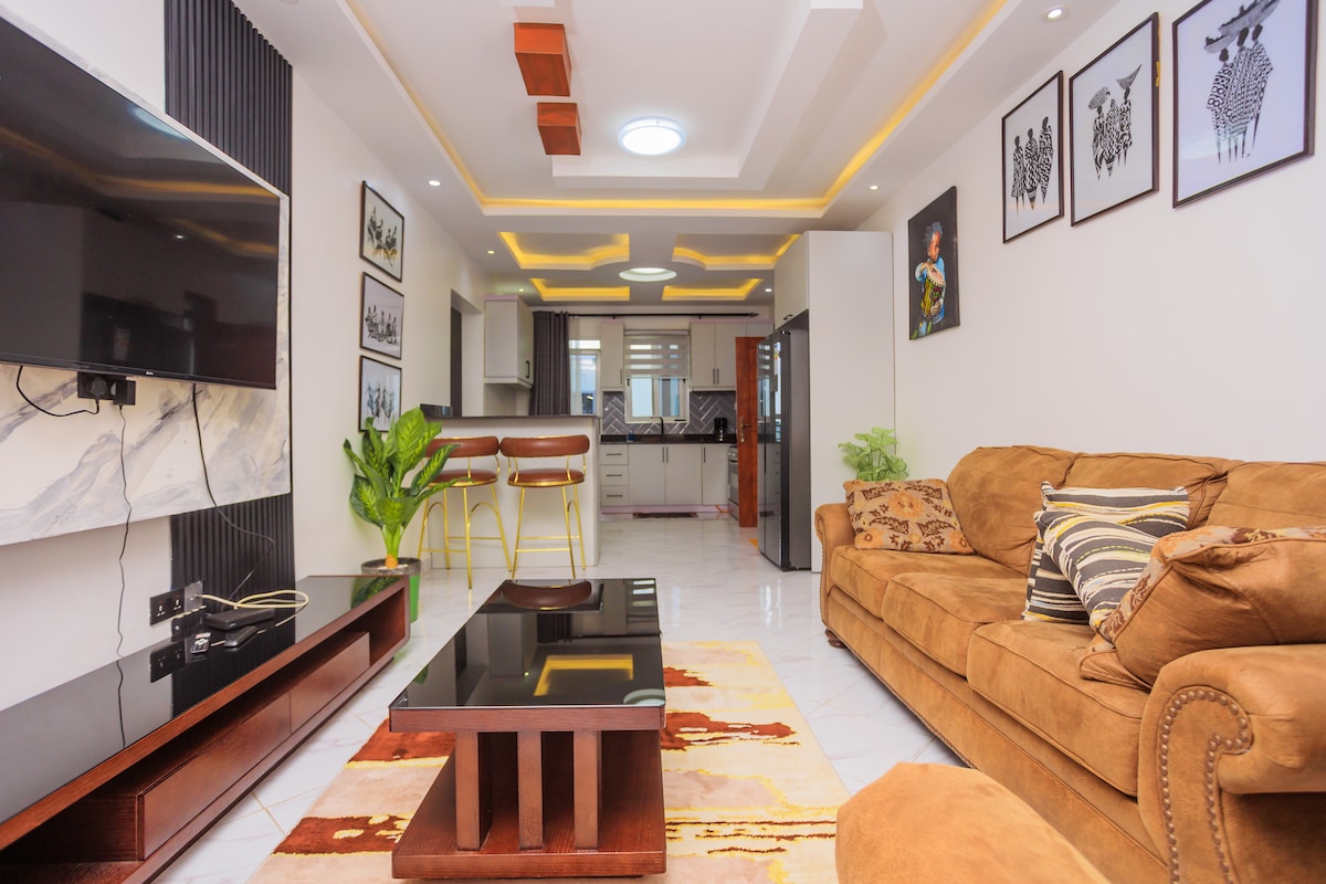Entfliehe dieser luxuriösen Wohnung mit 1 Schlafzimmer und nur 20 Minuten vom internationalen Flughafen Entebbe entfernt. Perfekt für einen Wochenendaufenthalt und ideal für mobil arbeitende Mitarbeiter, die ein ruhiges, stilvolles Ambiente suchen. Es verfügt über ein Queensize-Bett, eine voll ausgestattete Küche, ein modernes Badezimmer, Highspeed-WLAN und einen gemütlichen Wohnbereich mit einem Smart-TV. Genieße nahtlosen Komfort, moderne Annehmlichkeiten und eine ruhige Umgebung für Arbeit oder Entspannung. Dieser elegante Rückzugsort verspricht Komfort und Ruhe für deinen Urlaub.