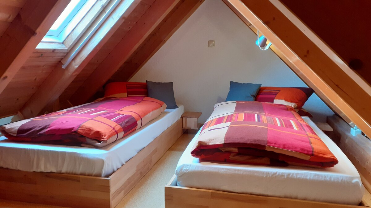 Die komfortable Ferienwohnung ist 60qm groß und für 2 Erwachsene und 2 Kinder ausgelegt. Im Schlafzimmer stehen zwei bequeme Einzelbetten. In der offenen, niedrigen Schlafkoje über dem Wohnzimmer (Raumspartreppe) befinden sich zwei Einzelbetten. Der Wohnraum mit Sofa und Fernseher lädt zum Verweilen ein. Bad mit Dusche und WC. Die kleine Küche ist mit Herd, Geschirr, Backofen, Wasserkocher, Kaffeemaschine, Kühlschrank und Esstisch ausgestattet. Im Garten können Sie die Sonne genießen.