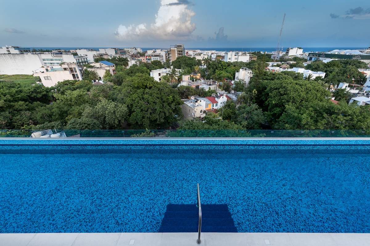 Moderno departamento frente al único parque del centro de Playa del Carmen. Tranquilo, luminoso y a unos minutos de la playa, cerca de cafés, tiendas, restaurantes y la 5ª Avenida. Disfruta la alberca rooftop con vista al mar, camastros, elevador, seguridad 24/7, estacionamiento subterráneo sin costo y lavandería común con lavadora y secadora. Ubicación ideal !!