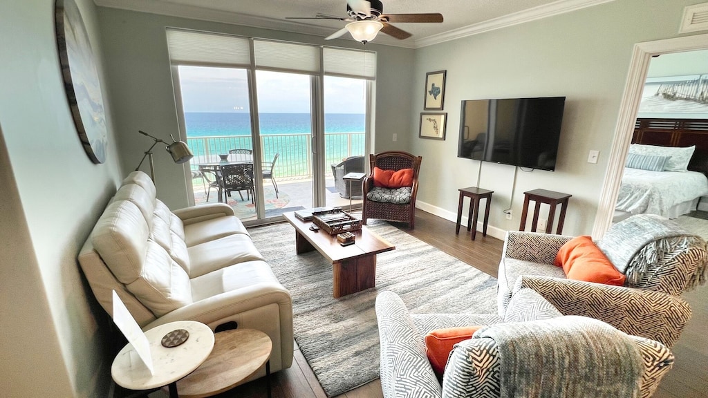 SPECTACULAR GULF-FRONT MASTER ! Amazing Westend Resort and RIGHT ON THE BEACH! Gulf Front Master with 30’ wide 160sqft PRIVATE balcony accessible from master & living area! Streaming 65" 4K TV plus 55” 4k in bdrms, fast Encrypted WiFi , tastefully decorated with “Beachy” feel fresh updates. This comfy getaway has 9’ tall sliders to view the Emerald Coast - pictures can’t do justice. Private bunk room, new sleeper. private beach & every amenity. Walk to Pier Park. Close to airport. It’s perfect!