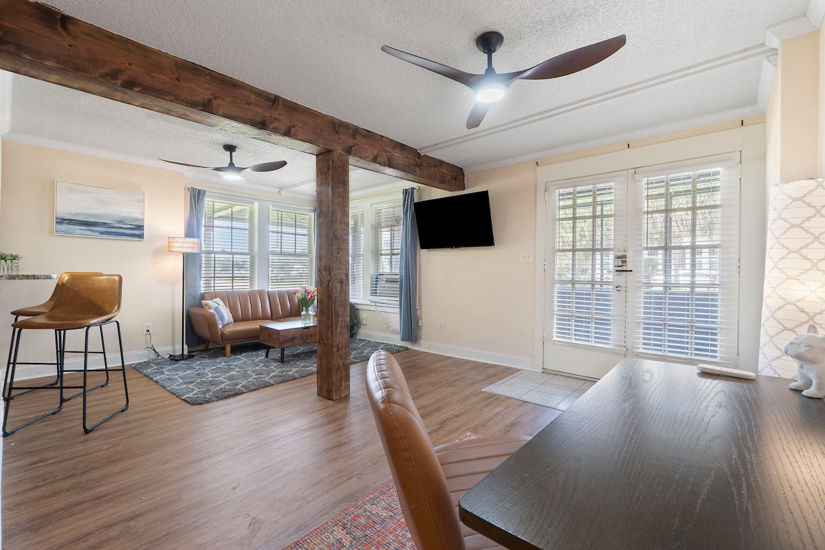 Kuratierter Stil nur wenige Gehminuten von Bars und Restaurants in der Innenstadt und nur eine 15-minütige Autofahrt vom Pensacola Beach entfernt! Diese Wohnung verfügt über eine voll ausgestattete Küche, einen separaten privaten Eingang, schnelles Highspeed-Internet, eine Waschmaschine und einen Trockner in der Einheit, einen beheizten Badezimmerboden und eine kommerziell bewertete Schalldämmung. Die Wohnung verfügt über 11-Fuß-Decken, luxuriöse Bettwäsche und Kissen aus 100 %cBaumwolle, eine Regendusche und einen privaten Parkplatz, der nur wenige Schritte vom Eingang entfernt ist.