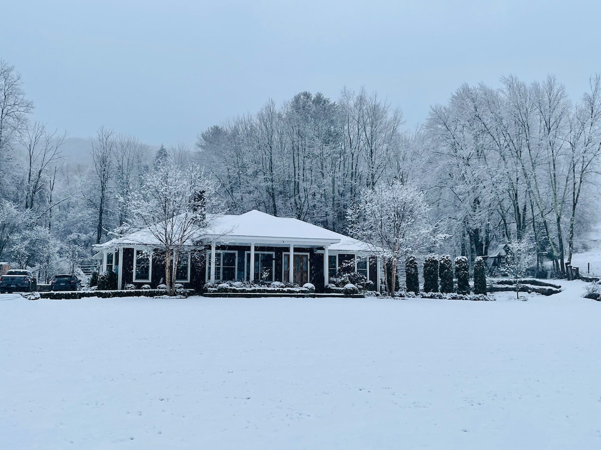 Diese Designer-Hütte verbindet natürliche Materialien und moderne Oberflächen. — anspruchsvoll und gemütlich. Blicke auf den atemberaubenden, quellgespeisten Teich (oder schwimme darin!) – nur wenige Schritte vom Haus entfernt. Entspanne dich auf der Terrasse oder genieße Kaffee im Sonnenzimmer. Die Innenräume verfügen über drei Schlafzimmer, zwei Badezimmer, ein Wohnzimmer mit schicken und gemütlichen Möbeln und einem Holzkamin sowie eine voll ausgestattete Küche, in der das Kochen zum Vergnügen wird. Unterhalte deine Familie und Freunde am Tisch für 10 Personen und gehe dann mit einem Getränk in der Hand weiter auf das Grundstück.