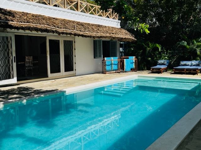 Traditional Swahili style house, stands on coral headland overlooking sea, beach, beautiful flowering gardens, private access to beach. Swimming pool recently installed, SEE HOUSE RULES Villa has 2 levels & views of Indian Ocean, private direct access to the beach, which stretches out either side, within the Marine Park. Includes 3 staff, cook, and daily room service, and gardener. Sleeps up to 10. Easily adapted and made comfortable to host smaller groups, by using just the upstairs bedrooms.